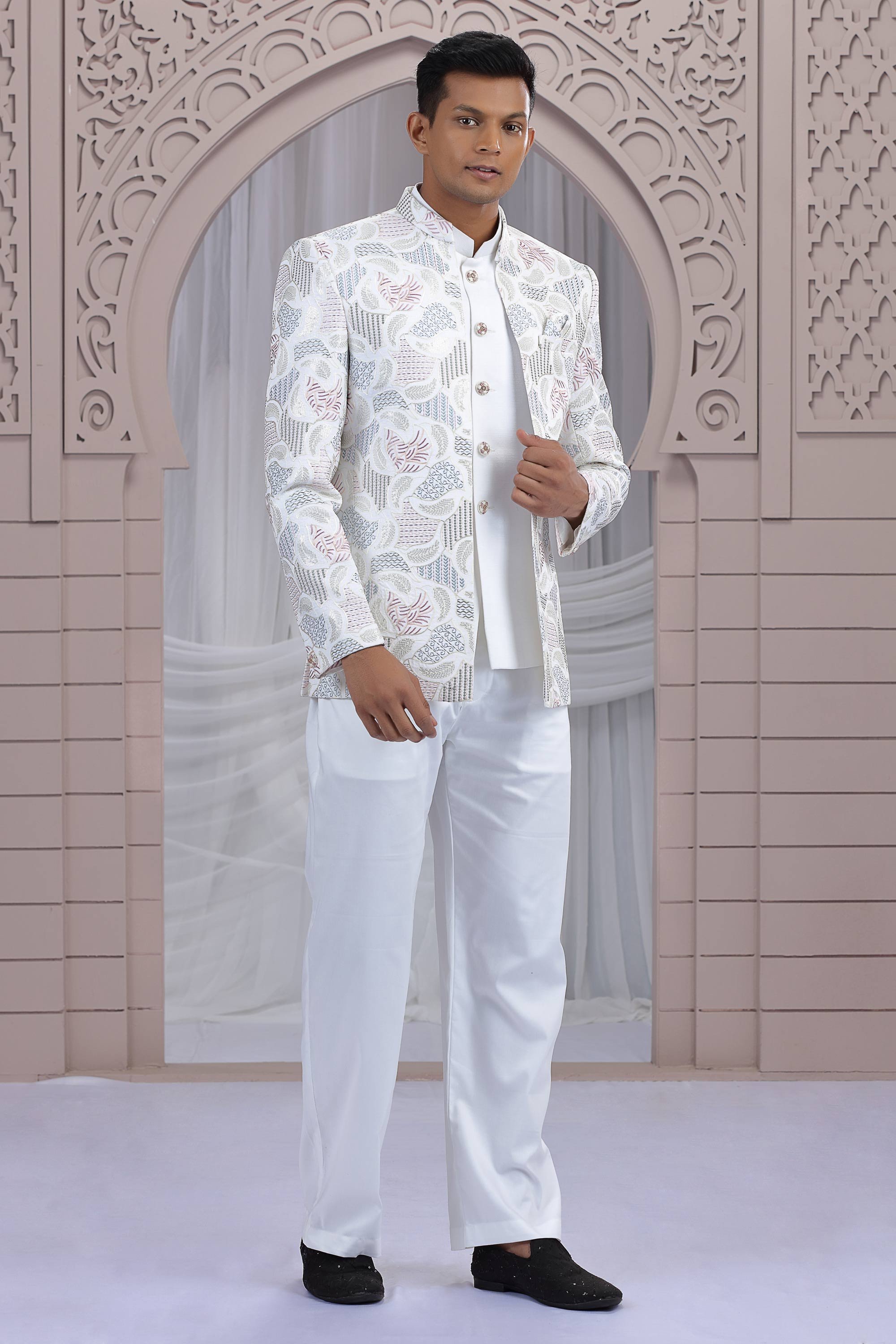 Off White Gorgeous Art Silk Wedding Wear Readymade Indo Western Jodhpuri Suit For Men
