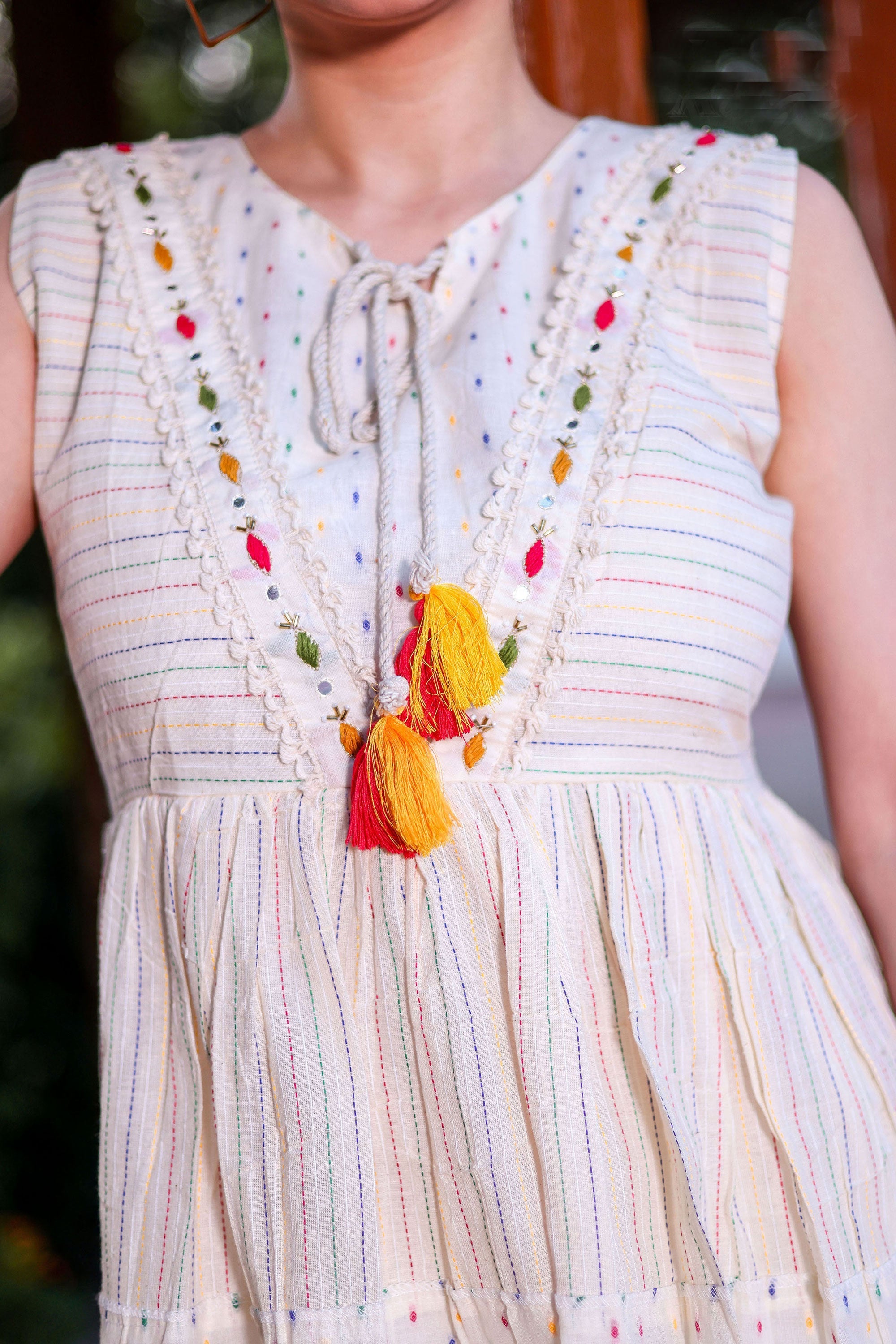 Embroidery, patchwork, and threadwork may exhibit slight irregularities—these natural variations enhance the unique charm of each piece. To maintain its beauty, we recommend turning the garment inside out before washing to prevent abrasion.