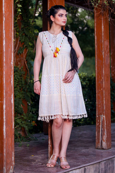 Women's Thread Work Smocked Off White Knee Length Kurti