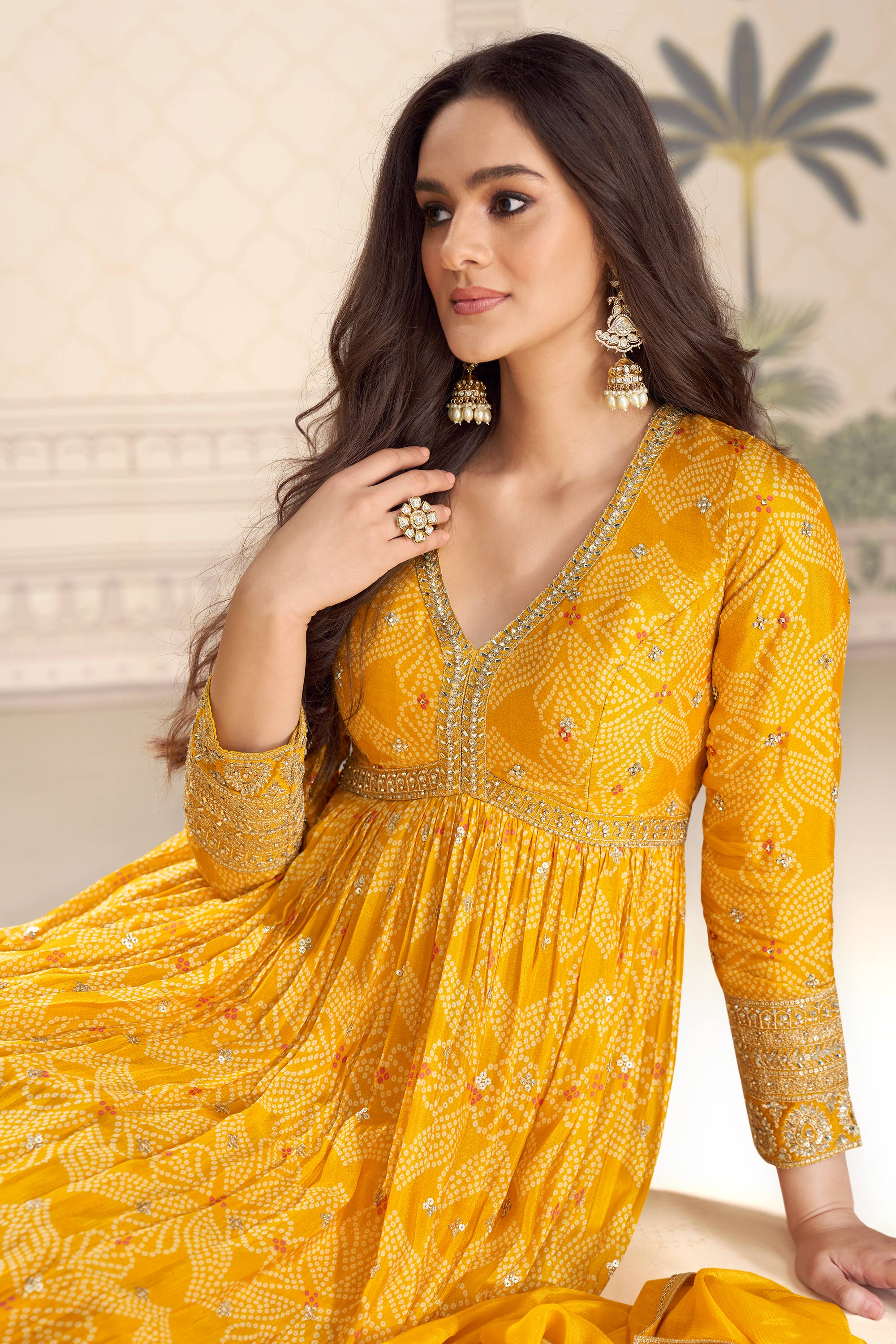 Yellow Party Wear Chinon Silk Bandhani Print Gown With Fancy Dupatta
