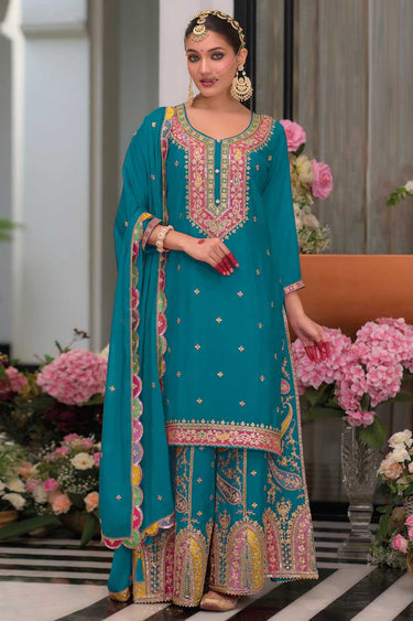 Chinon Fabric Captivating Teal Color Readymade Palazzo Suit