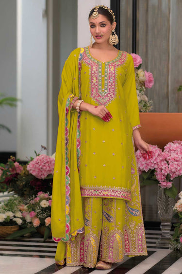 Step into style with this Readymade Palazzo Suit, designed to blend grace and comfort for festive occasions. Crafted from premium Chinon fabric, the suit features a 40-inch top length that flows elegantly, paired with matching Chinon bottom and dupatta for a coordinated look. Perfect for festivals, functions, Sangeet nights, and Eid celebrations, this ensemble ensures you shine effortlessly. Note: Slight color variations may occur due to digital photography. Turn heads at every celebration with this must-have outfit!