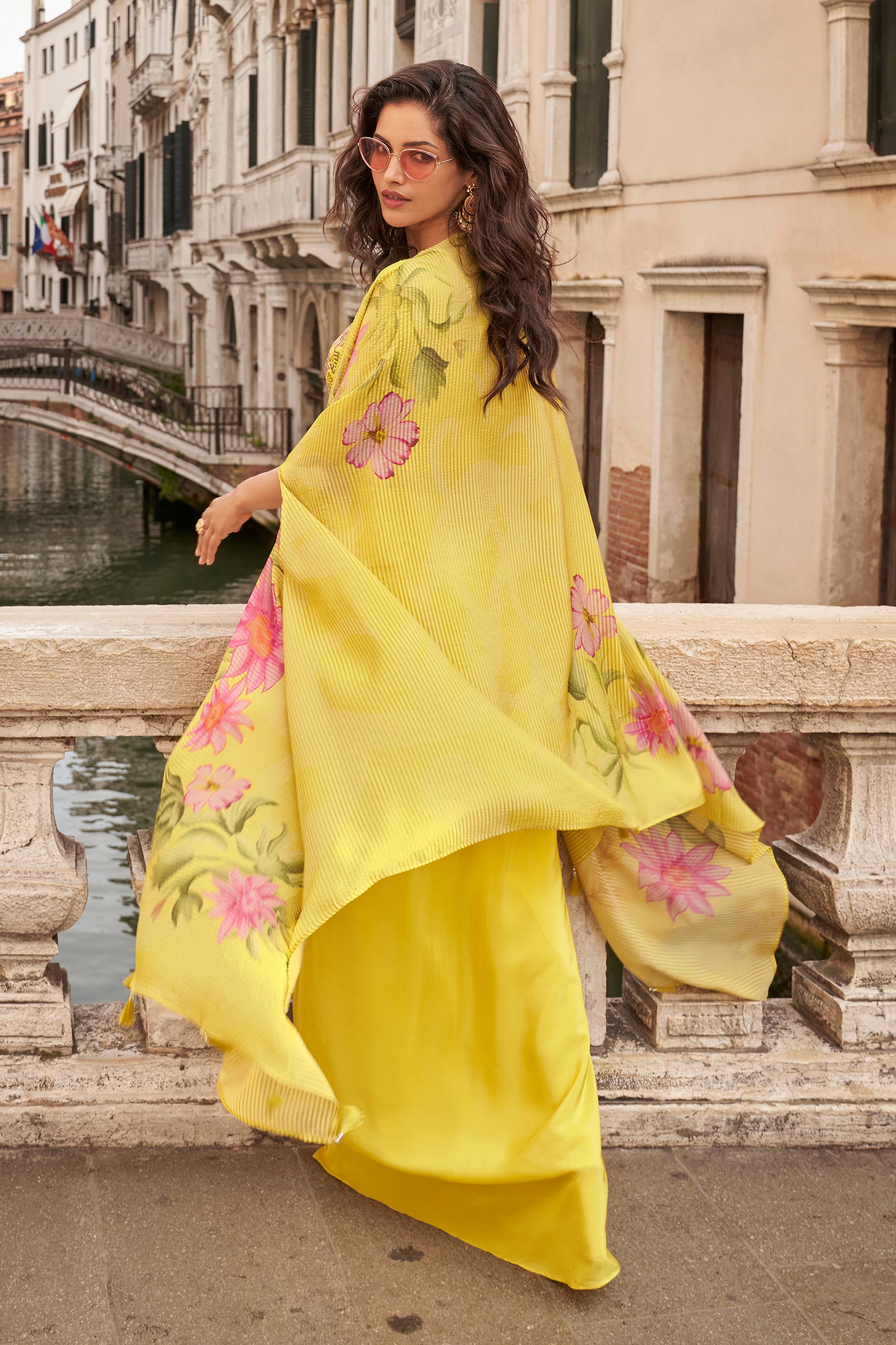 Yellow Party Wear Chinon Embroidered Readymade Palazzo Set With Designer Blouse And Shrug