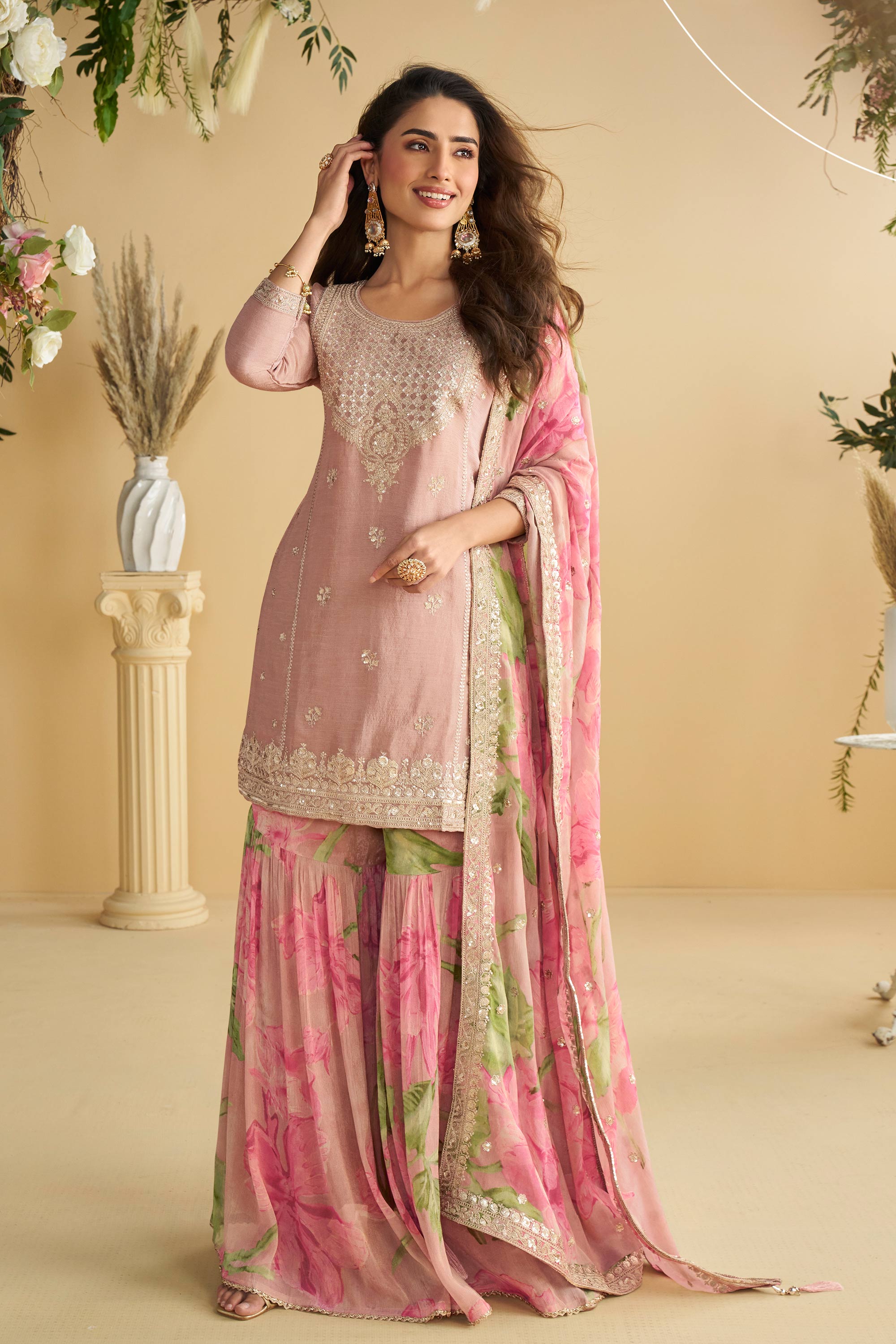 Step into effortless style with this thoughtfully crafted Chinon fabric outfit. This set features a gorgeously embroidered readymade top, a complementing dupatta, and eye catching printed palazzo pants. Whether its a family event, a festive gathering, or a casual day, this ensemble strikes the right balance of tradition and modern design. The breathable, lightweight fabric ensures a comfortable wear throughout the day, while the detailed embroidery adds a touch of sophistication. Let this fashionable and functional set elevate your everyday and occasion ready wardrobe with grace.
