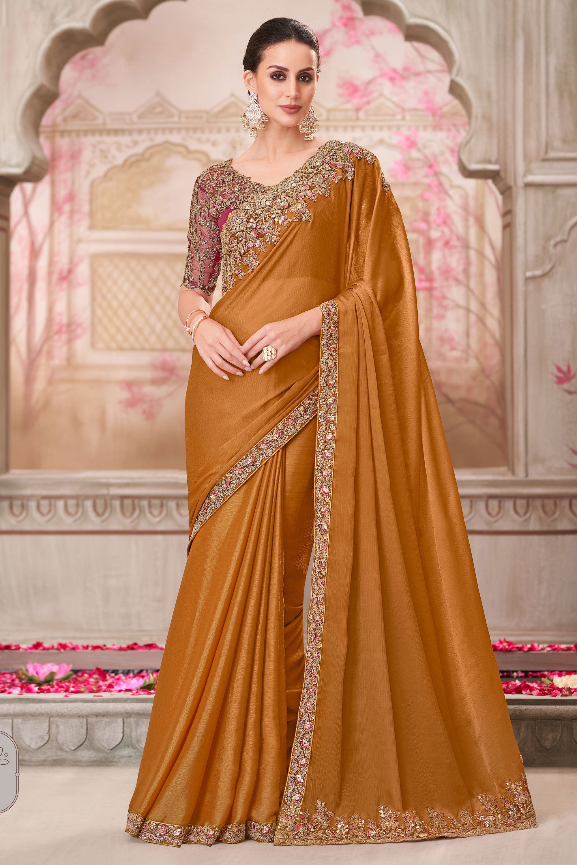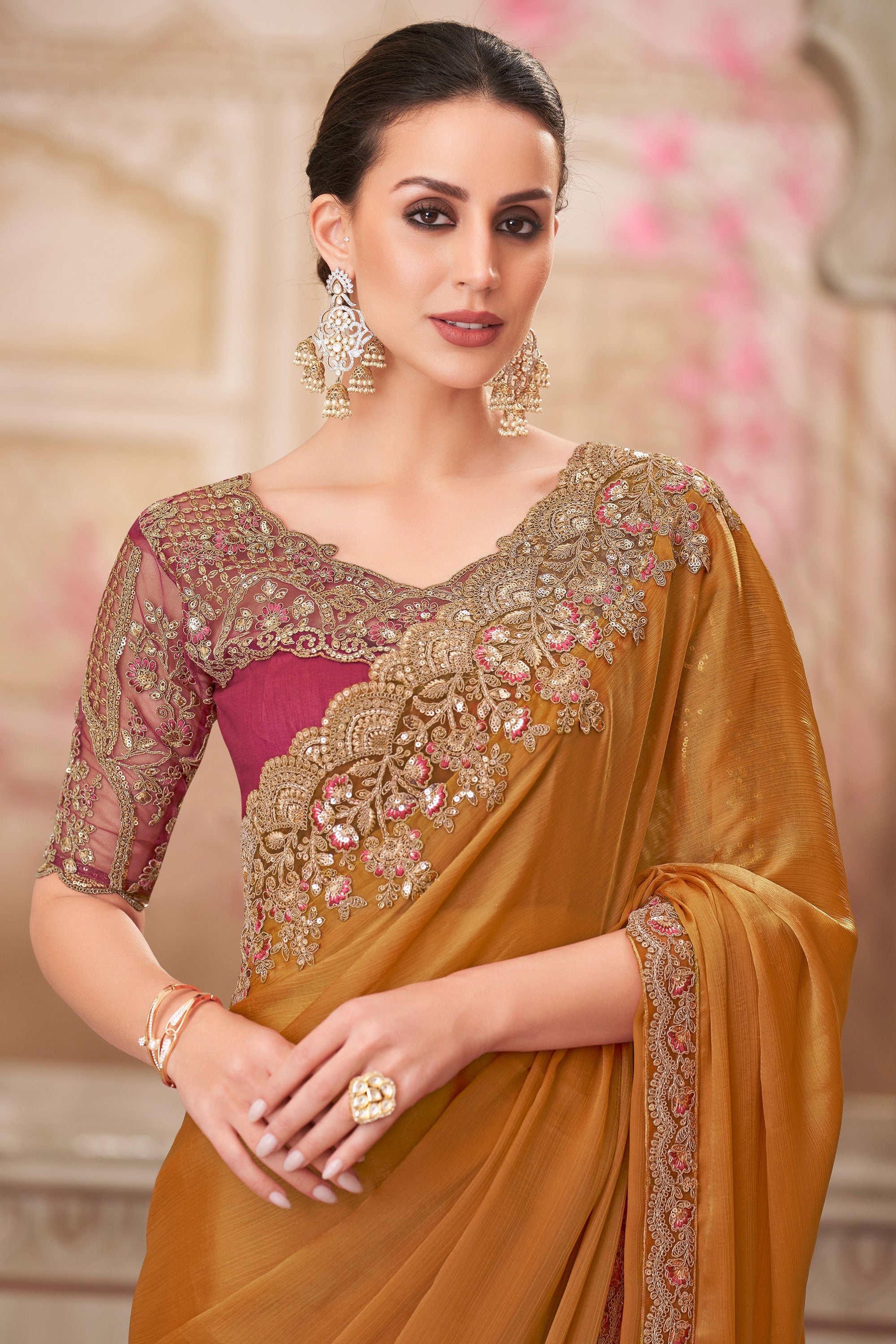 Brown Chiffon Silk Party Style Adroit Lace Border Work Saree With Designer Blouse