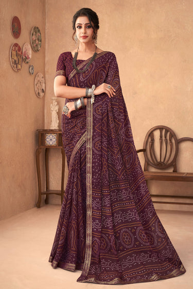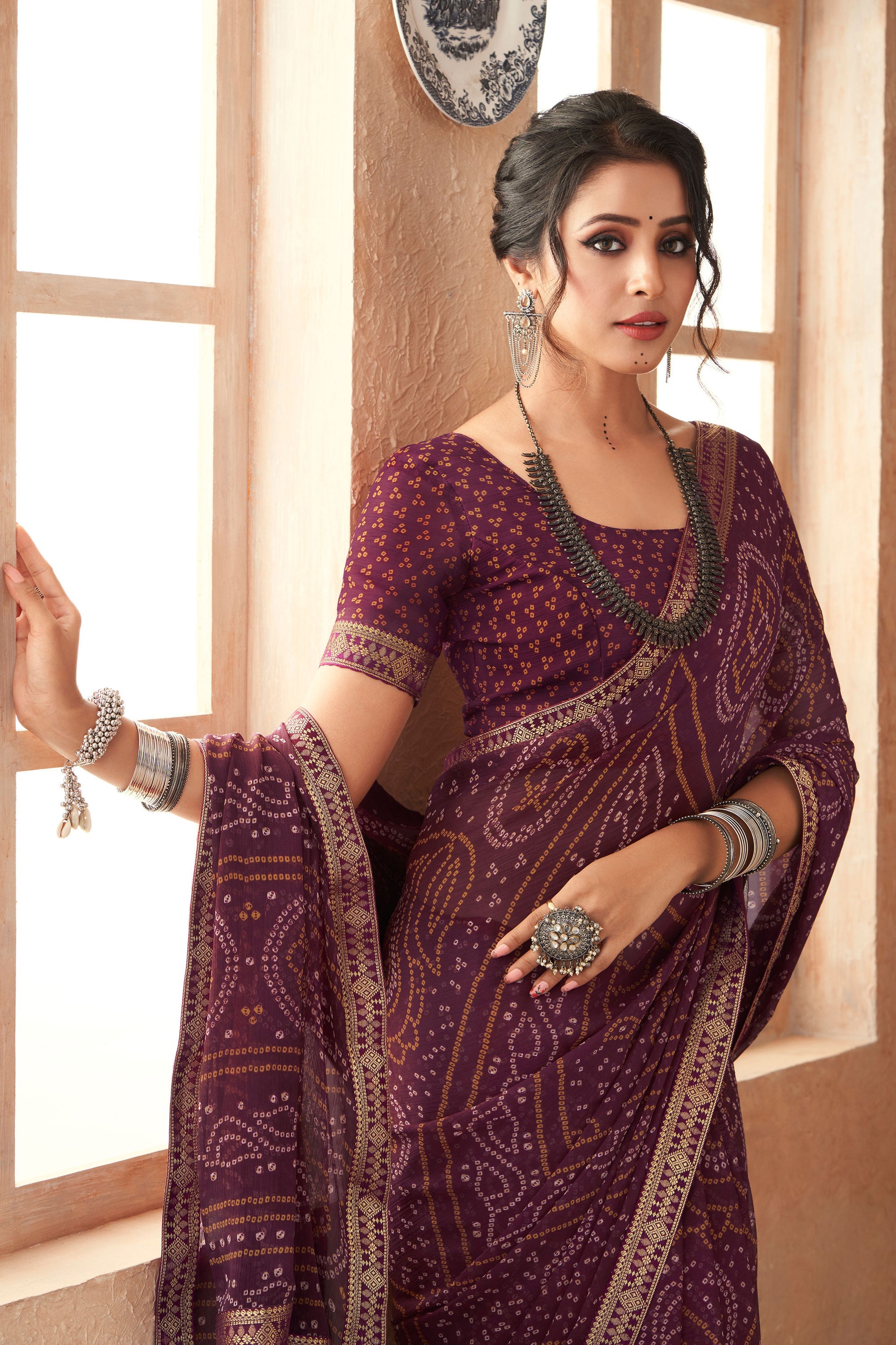 Casual Bandhani Print Attached Banarasi Border Saree In Wine Color