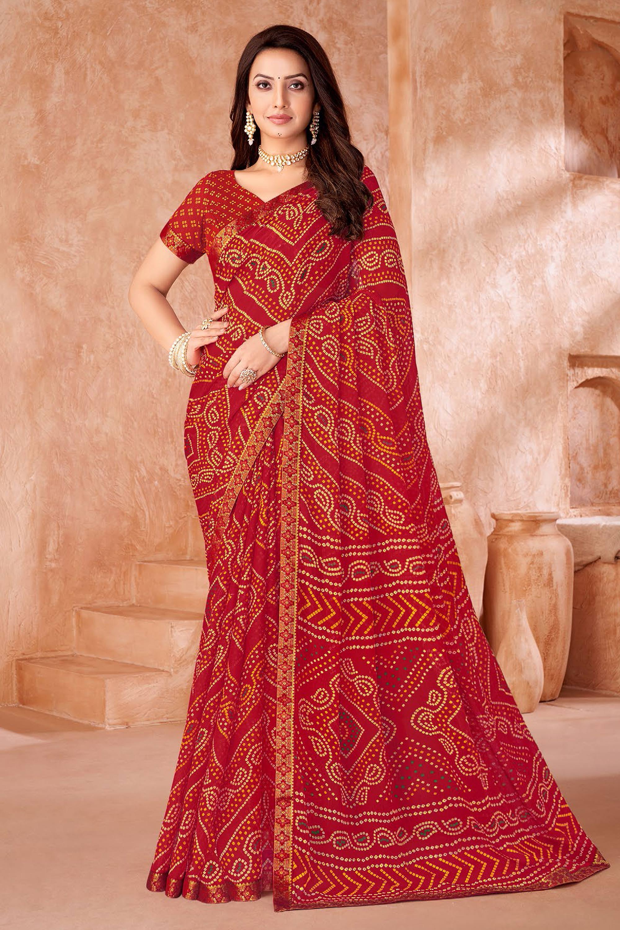 Enhance your everyday look with this vibrant Bandhej Print Chiffon Saree that comes paired with a matching blouse piece. The soft and lightweight chiffon fabric offers effortless elegance and all-day comfort. Perfect for casual or semi-formal occasions, the Bandhej print celebrates cultural heritage in a simple yet stylish way. This saree’s airy texture makes it ideal for hot weather, allowing you to stay cool and look radiant wherever you go.