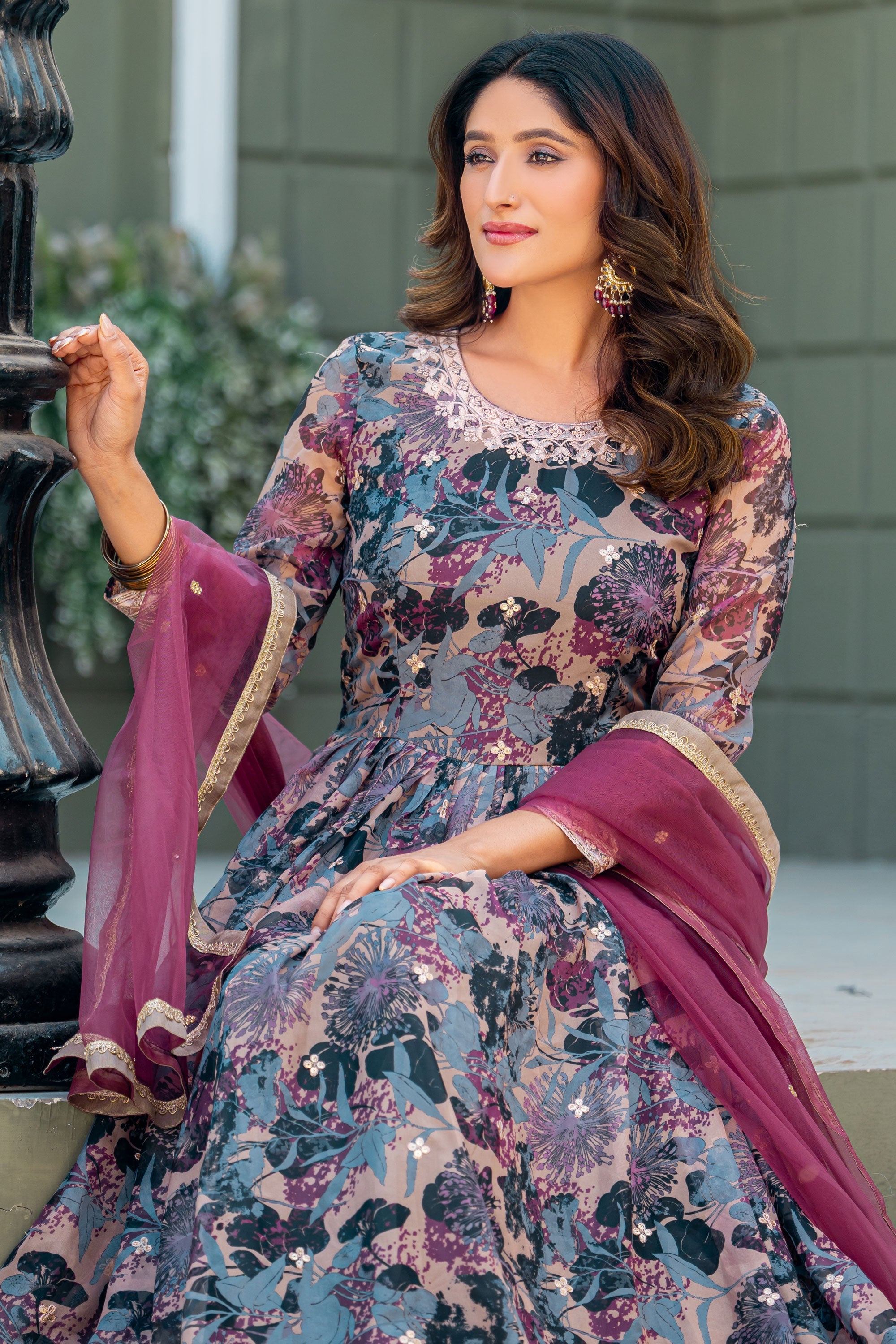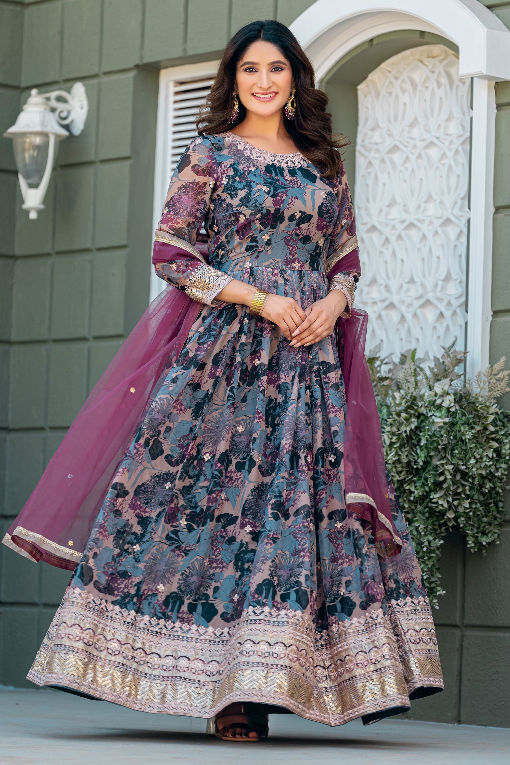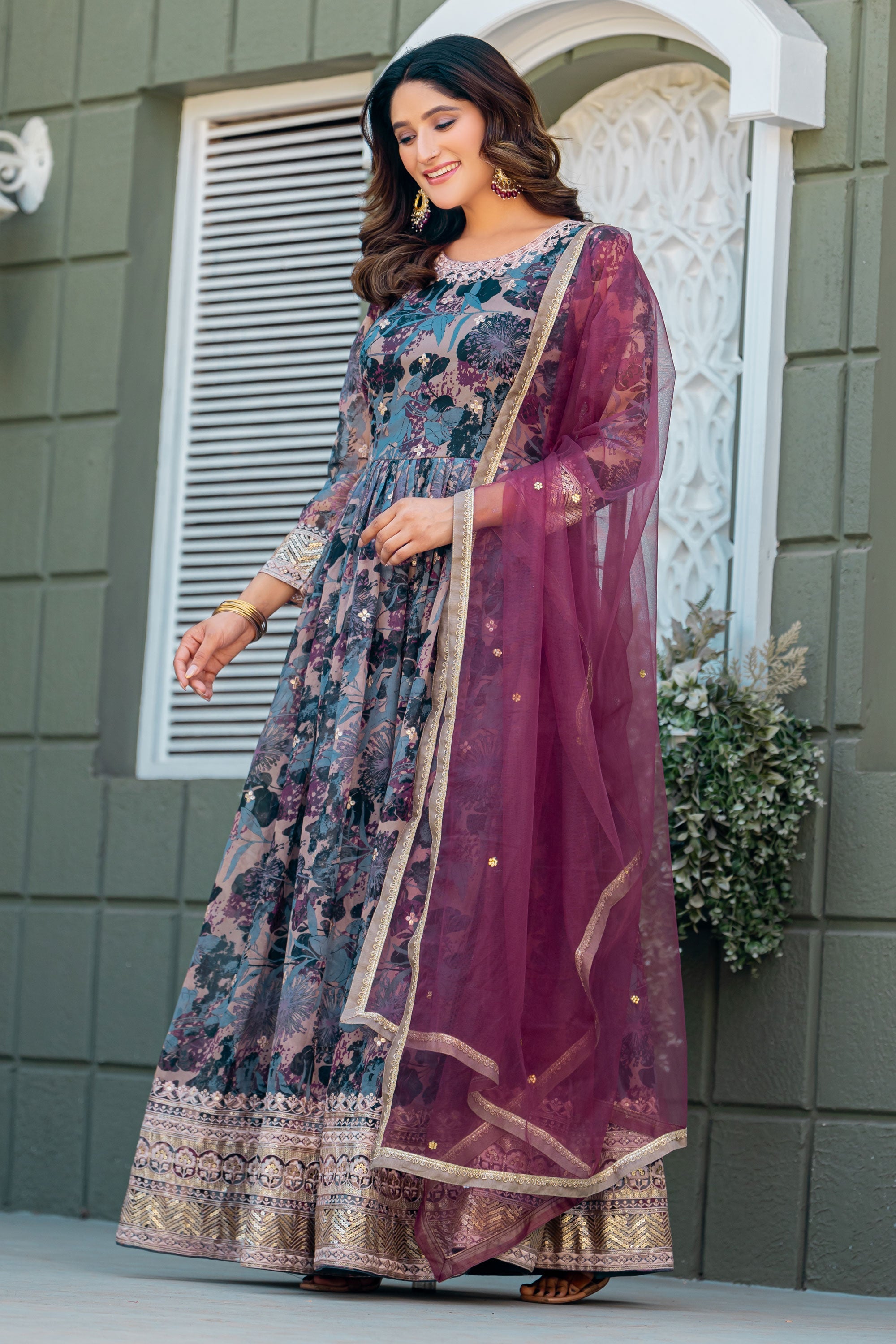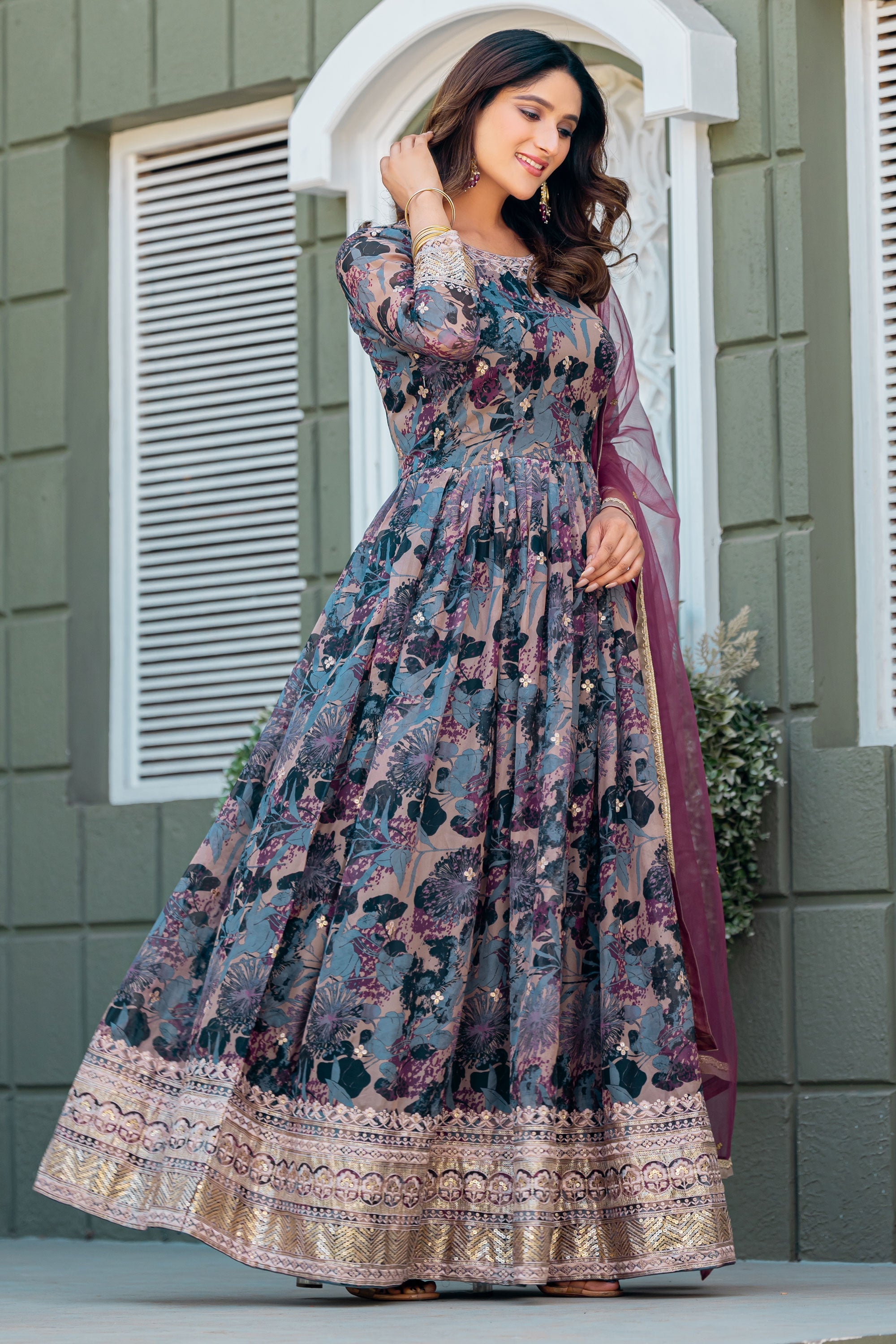 Step into elegance with this Designer Grey Art Silk Anarkali Style Gown with Dupatta. This floor-length outfit showcases a stunning silhouette with its beautifully flared design, tailored to exude grace at every occasion. Made with premium art silk fabric, it combines comfort with a luxurious finish, making it ideal for weddings, parties, and festive gatherings. The soft grey tone adds a touch of sophistication, complemented by the dupatta for a classic ethnic ensemble. Lightweight yet regal, this gown is a wardrobe essential for women seeking style with simplicity. Elevate your traditional look with this charming attire today.