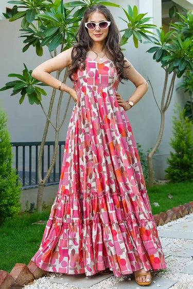 Engaging Pink Color Digital Printed Rayon Fabric Readymade Gown