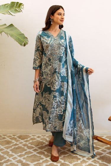 Exclusive Blue Turquoise Floral Printed Ethnic Set With Embroidery And Dupatta