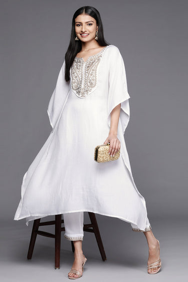 Exclusive Casual Wear White Color Printed Pashmina Fabric Readymade Kurti With Bottom