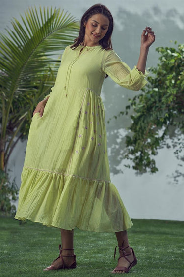 Exclusive Green Color Mal Cotton Fabric Readymade Midi Dress