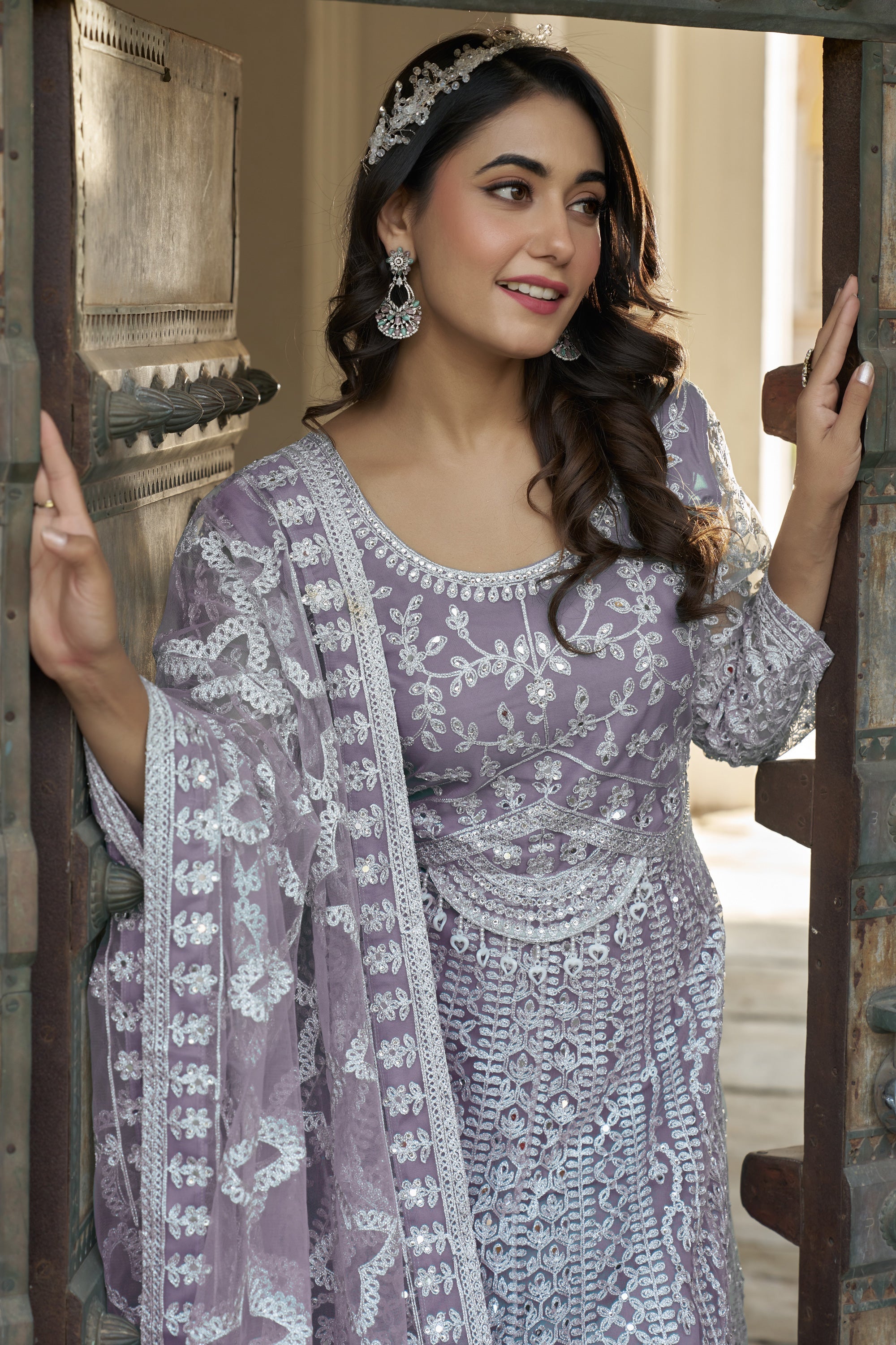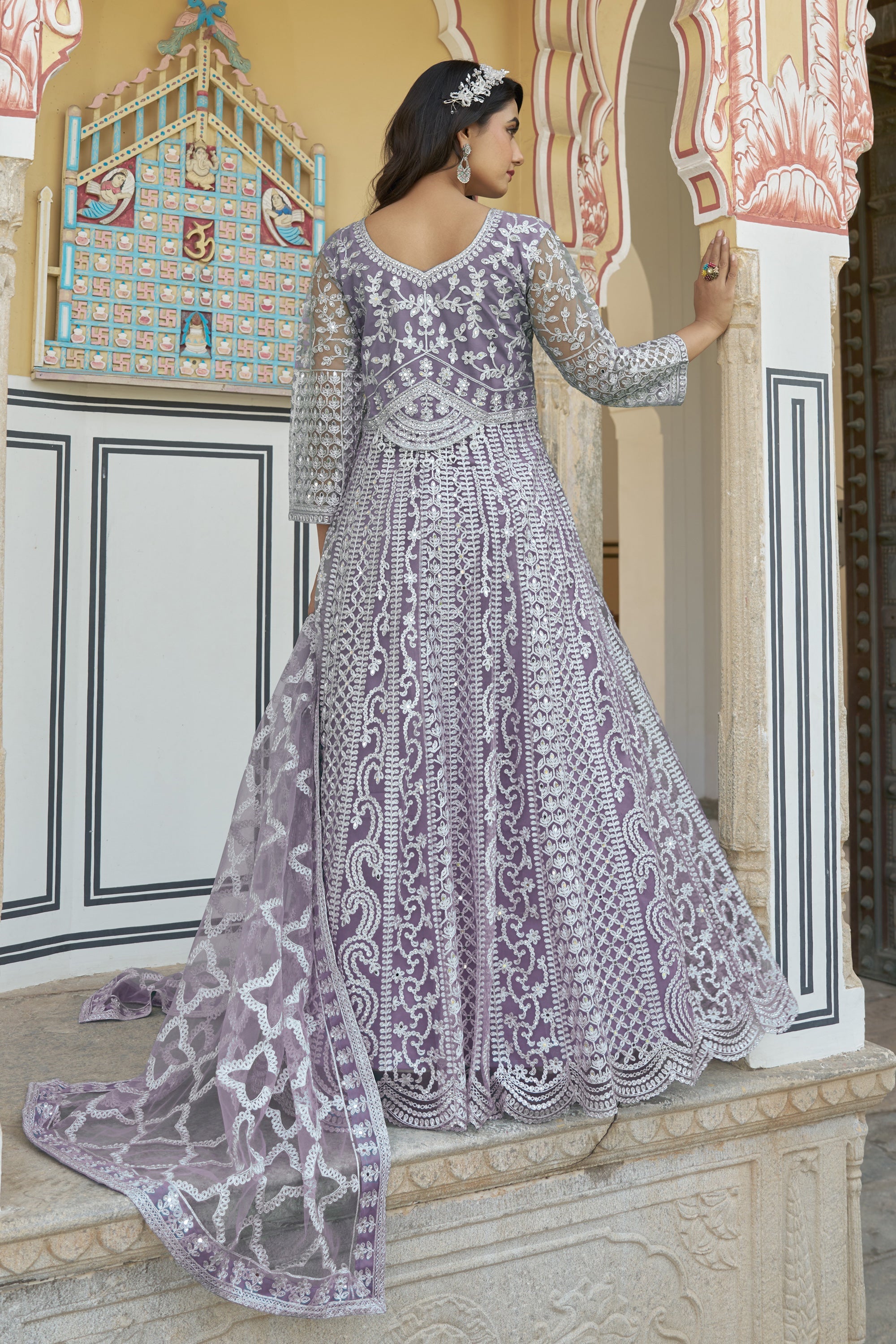 Lavender Net Party Wear Readymade Anarkali Style Gown With Dupatta