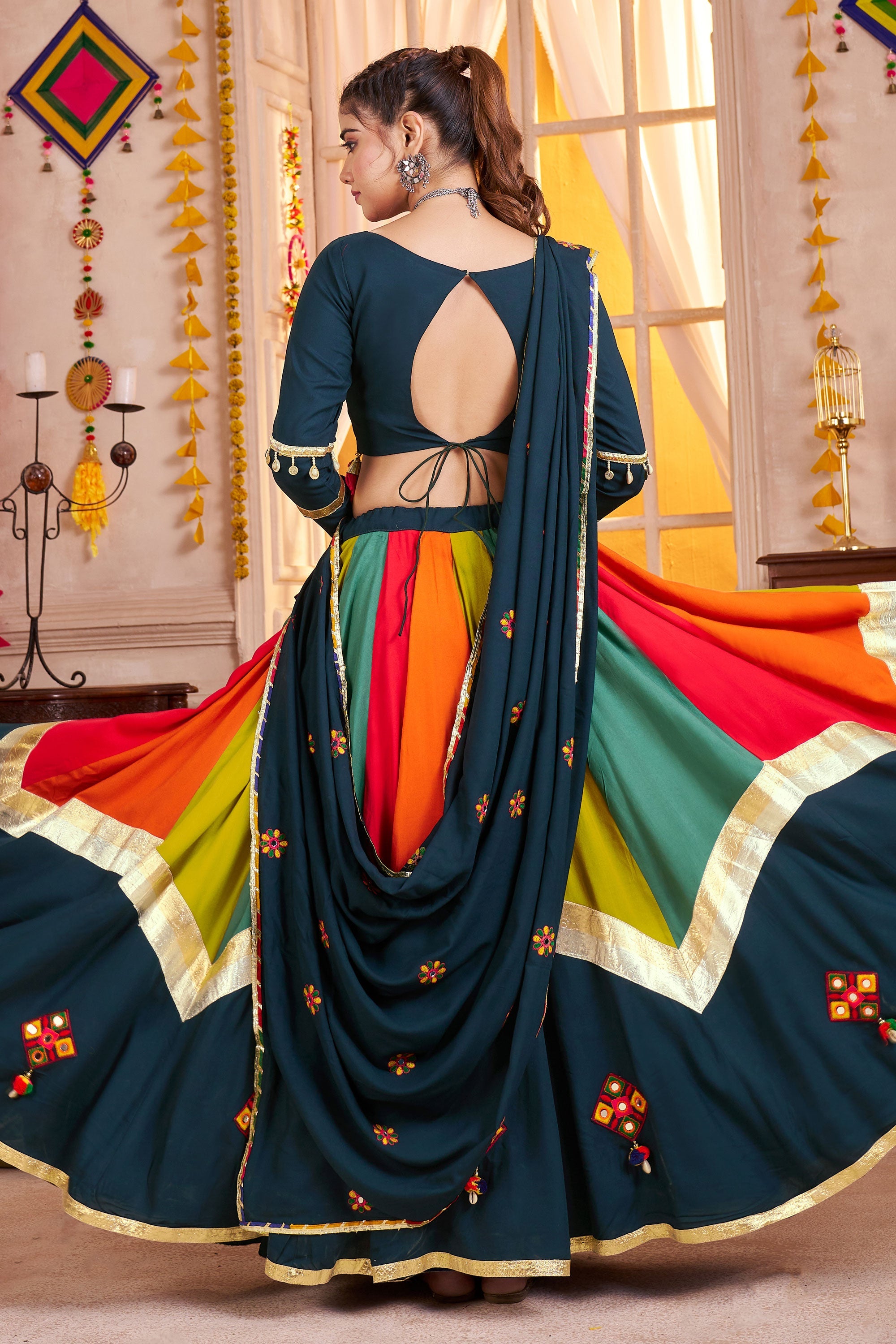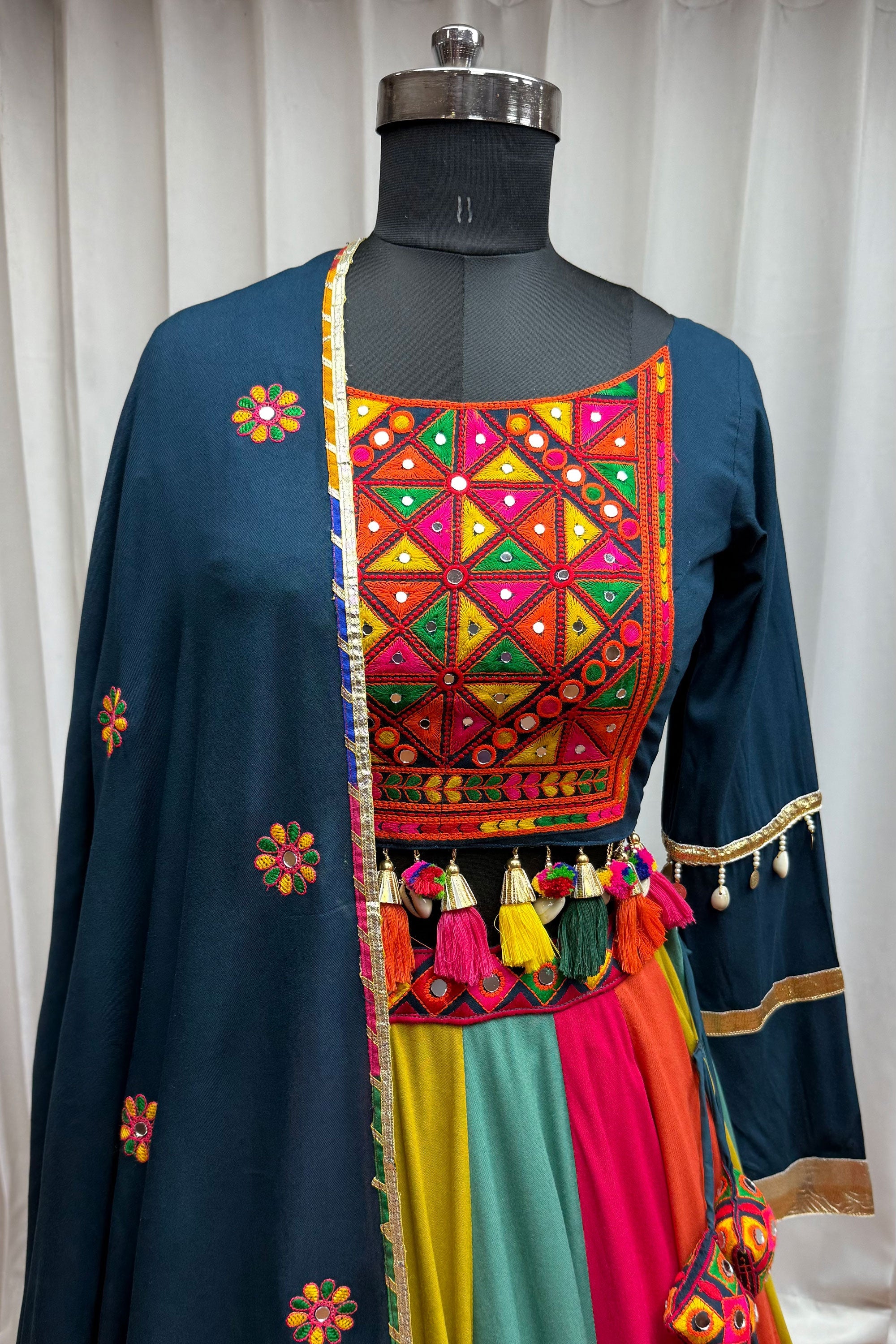 Turn heads at Navratri celebrations with this stunning viscose cotton embroidered lehenga featuring delicate mirror work. Pre-stitched for your convenience, it ensures a comfortable fit while exuding effortless charm. The lehenga's premium quality fabric offers breathability and durability, making it an ideal choice for dancing through the night. The mirror accents add just the right amount of sparkle to reflect your vibrant energy during the festivities. Whether it’s Garba, Dandiya, or a festive gathering, this outfit will have you standing out in any crowd. Effortlessly elegant, it’s the perfect blend of traditional design and modern ease.