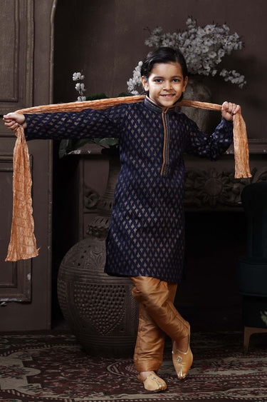 Navy Blue Cotton Fabric Printed Reception Wear Readymade Boys Kurta Pyjama