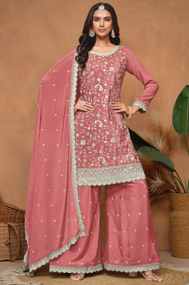 Elevate your function wear collection with our exquisite Palazzo Suit, meticulously crafted from luxurious Chinon fabric. This ensemble is designed to offer both elegance and comfort, making it the perfect choice for any special occasion., Top: Premium Chinon, Bottom: Premium Chinon, Dupatta: Premium Chinon, Inner Fabric: Soft Santool, Top Length: 38 inches, Work: Intricate Embroidery, Occasion: Ideal for Function Wear The top features stunning embroidery that adds a touch of opulence, while the flowing palazzo pants provide a chic and contemporary silhouette. The matching Chinon dupatta complements the ensemble, enhancing its overall appeal. To preserve the intricate embroidery and vibrant fabric, we recommend dry cleaning for the first wash. Please note that slight color variations may occur due to different lighting conditions and fabric properties.