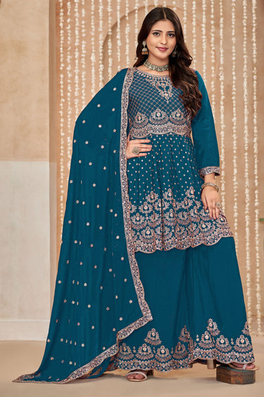 Classic Teal Color Function Wear Palazzo Suit In Chinon Fabric