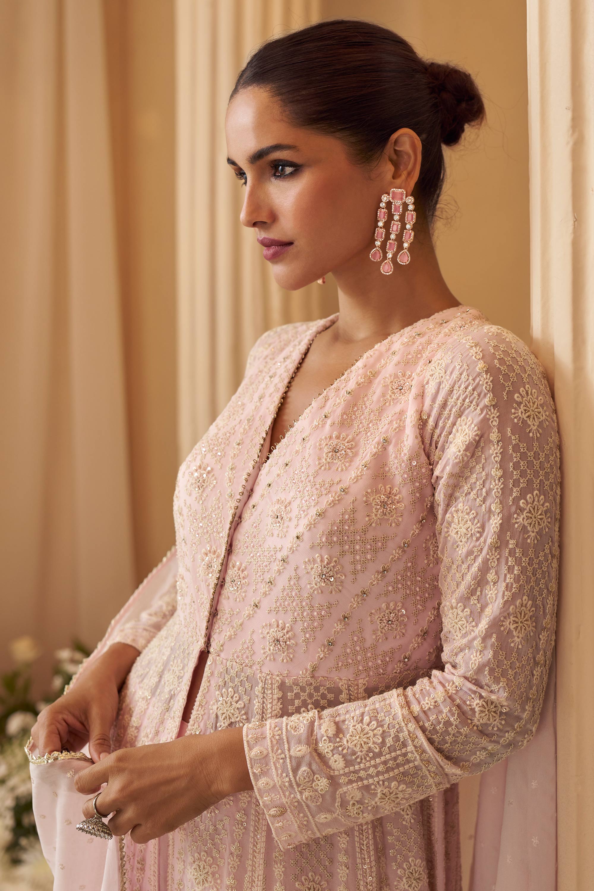 Georgette Embroidered Pink Readymade Palazzo Suit With Dupatta For Party Wear