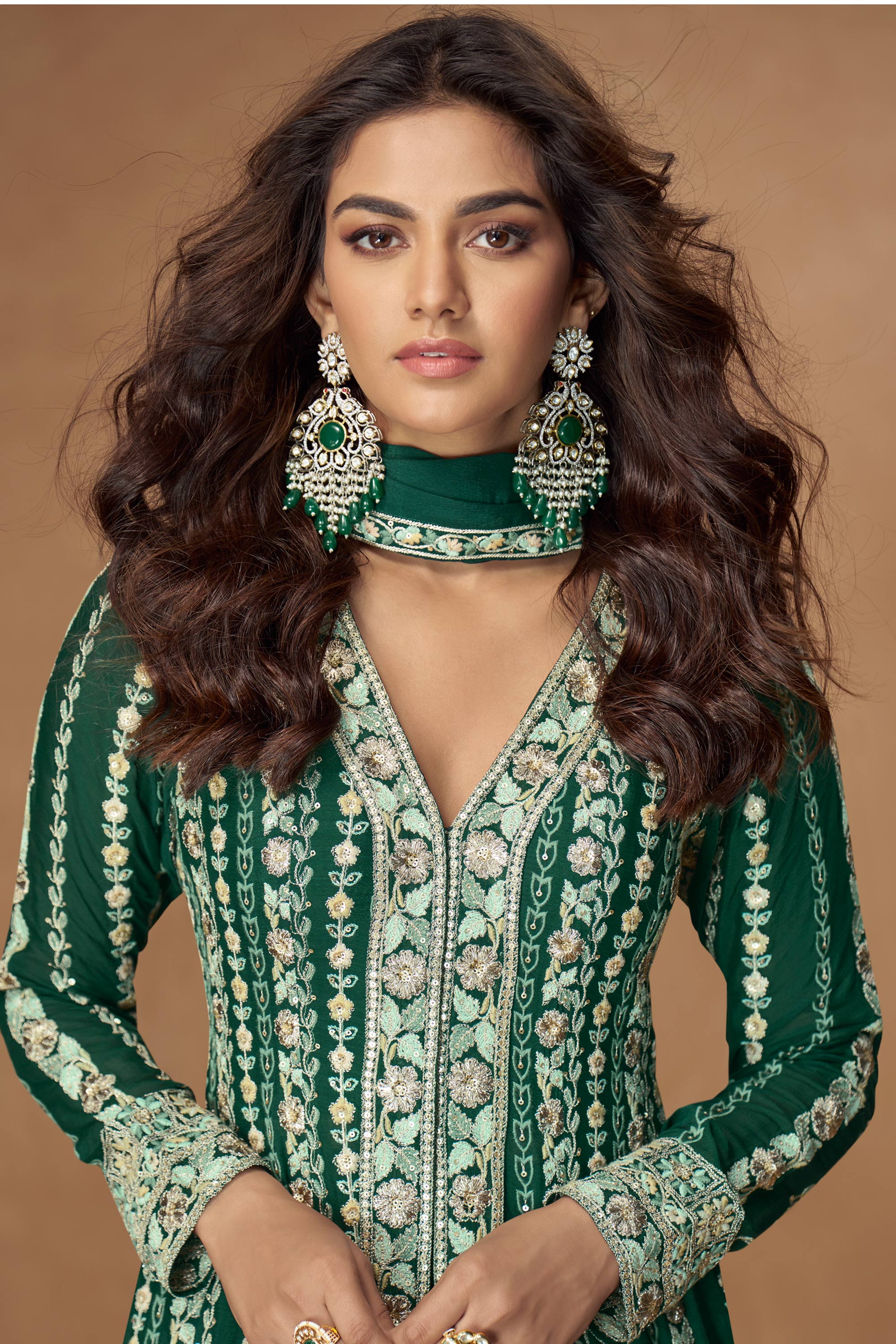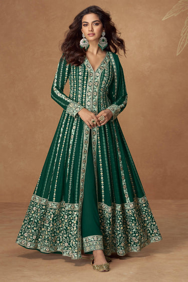 Green Chinon Silk Embroidered Readymade Anarkali Salwar Kameez