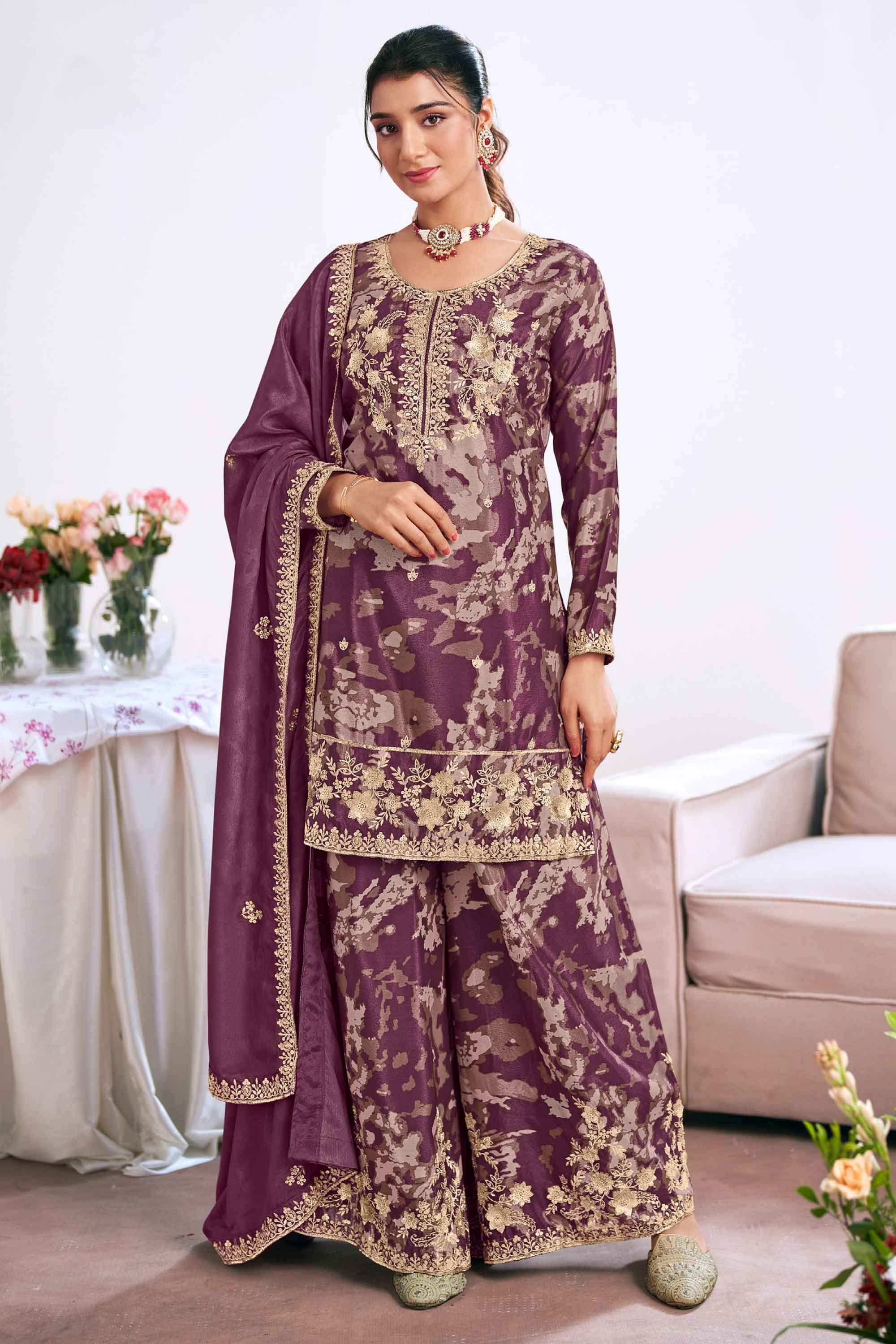 Lovely Purple Embroidery Work Readymade Palazzo Salwar Kameez
