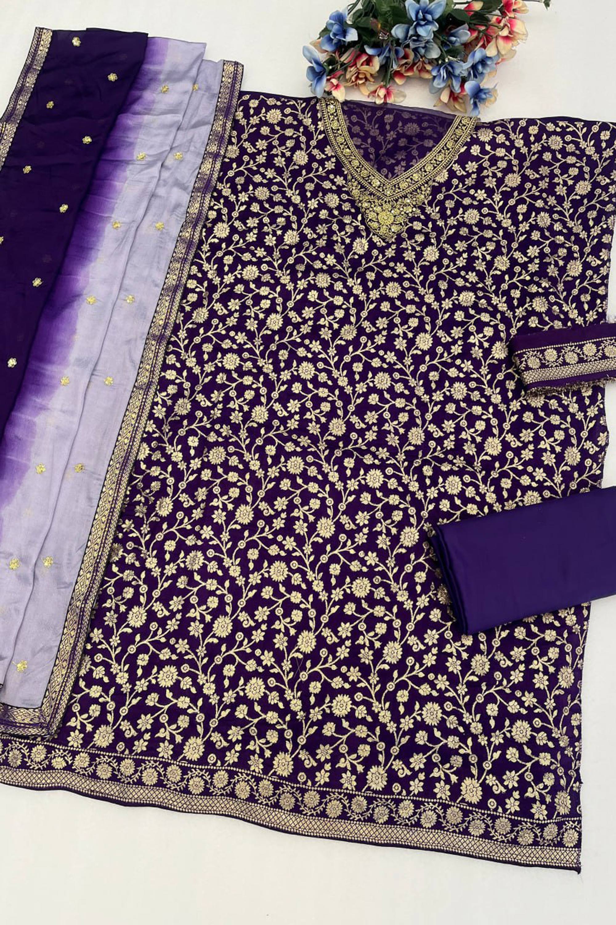 Shilpa Shetty Purple Viscose Silk Designer Palazzo Suit With Chinon Silk Dupatta