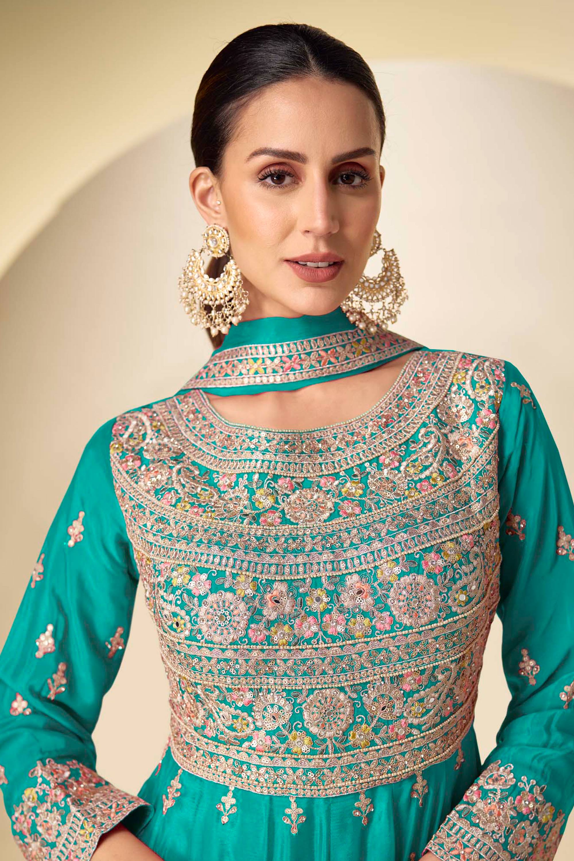 Teal Festive Wear Chinon Embroidered Readymade Anarkali Salwar Suit