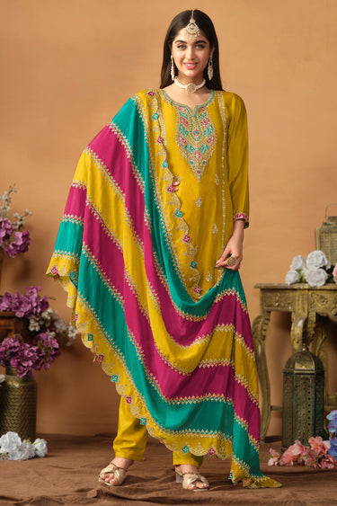 Yellow Color Chinon Silk Fabric Tempting Salwar Suit With Multi Color Dupatta