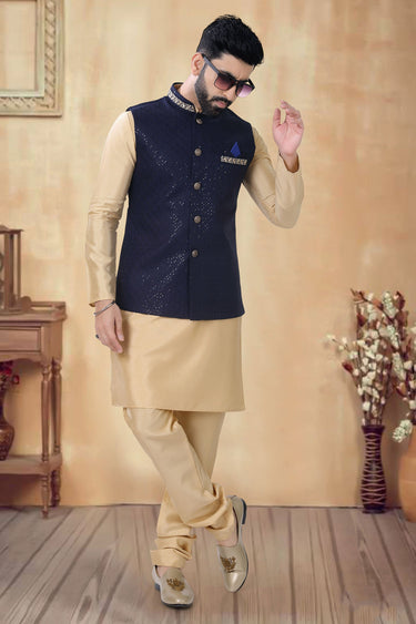 Upgrade your festive wardrobe with our Readymade Cream Color Kurta Pyjama for Men. Made from premium Art Silk fabric, this ensemble ensures comfort and a classy look. The 3-piece set features a stylish kurta and pyjama complemented by a detailed jacket, making it a complete package for special occasions. Whether it's a wedding, reception, or cultural event, this attire is designed to make you stand out. Easy to wear and maintain, this outfit combines tradition with modern style, making it a must-have in your ethnic collection.
