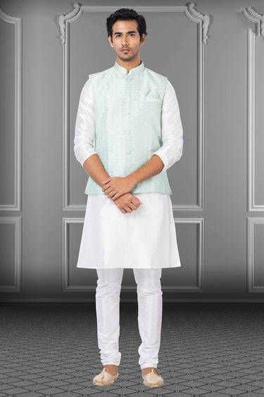 Dhupion Raw Silk Fabric White Festive Wear Readymade Men Stylish Kurta Pyjama With Nehru Jacket set