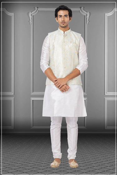 Dhupion Raw Silk Lovely White Festive Wear Readymade Kurta Pyjama For Men With Jacket