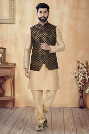 Elevate your traditional style with this exquisite Reception Wear Kurta Pyjama Set for Men. Crafted from luxurious cream-colored Art Silk fabric, this readymade set includes a beautifully designed kurta, matching pyjama, and a 3-piece jacket set that exudes sophistication. Perfect for weddings, receptions, or festive celebrations, this ensemble ensures you make a stylish statement. The fine craftsmanship and intricate detailing of the jacket add a touch of elegance, while the comfortable fit keeps you at ease. Experience timeless fashion with this must-have ethnic outfit.