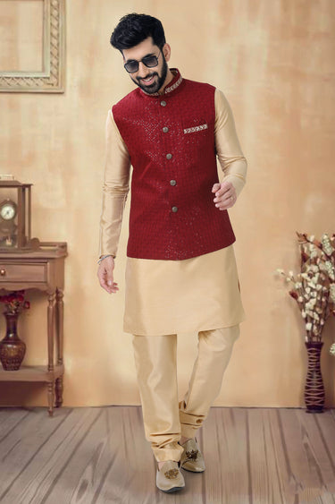 Make an elegant entrance at your next event with our Reception Wear Readymade Kurta Pyjama for Men. This cream-colored outfit is crafted from high-quality Art Silk fabric for a luxurious feel. It comes as a 3-piece jacket set, including a beautifully designed kurta, pyjama, and an intricately embroidered jacket that adds a touch of sophistication. Ideal for weddings, receptions, or any special occasion, this attire offers both style and comfort. Step out in confidence and charm in this traditional yet fashionable ensemble. Perfect for those who appreciate timeless elegance.
