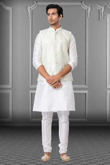 White Beautiful Dhupion Raw Silk Fabric Wedding Wear Readymade Kurta Pyjama For Men With Jacket