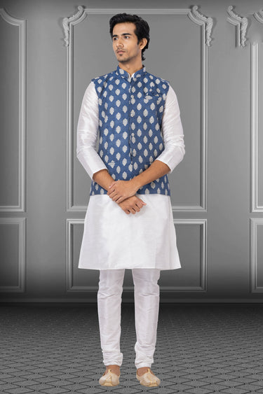 White Dhupion Raw Silk Fabric Reception Wear Striking Readymade Kurta Pyjama For Men With Jacket