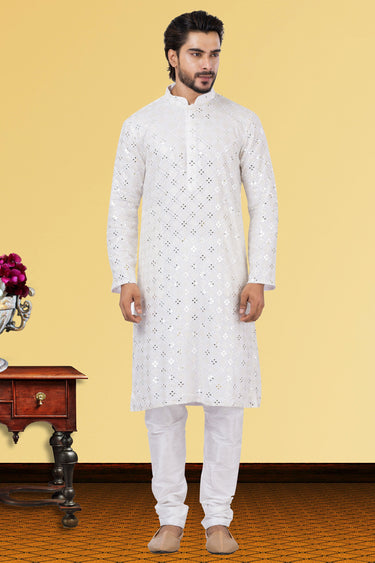White Georgette Fabric Trendy Readymade Kurta Pyjama For Men