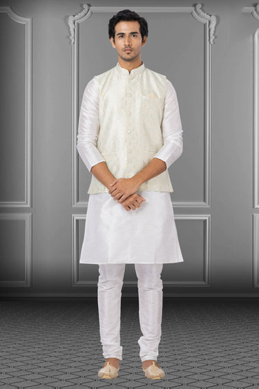White Gorgeous Dhupion Raw Silk Wedding Wear Readymade Kurta Pyjama For Men With Jacket