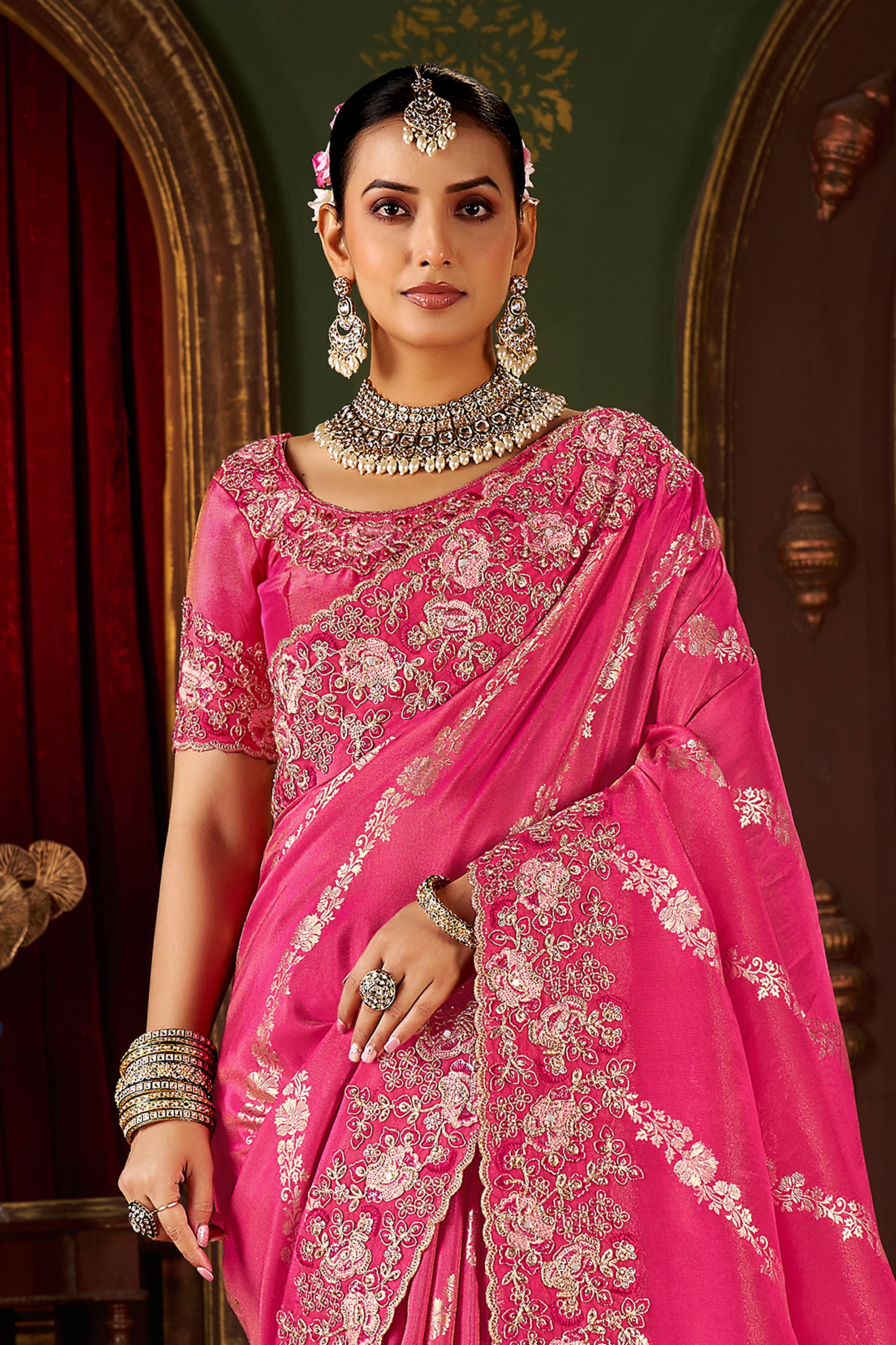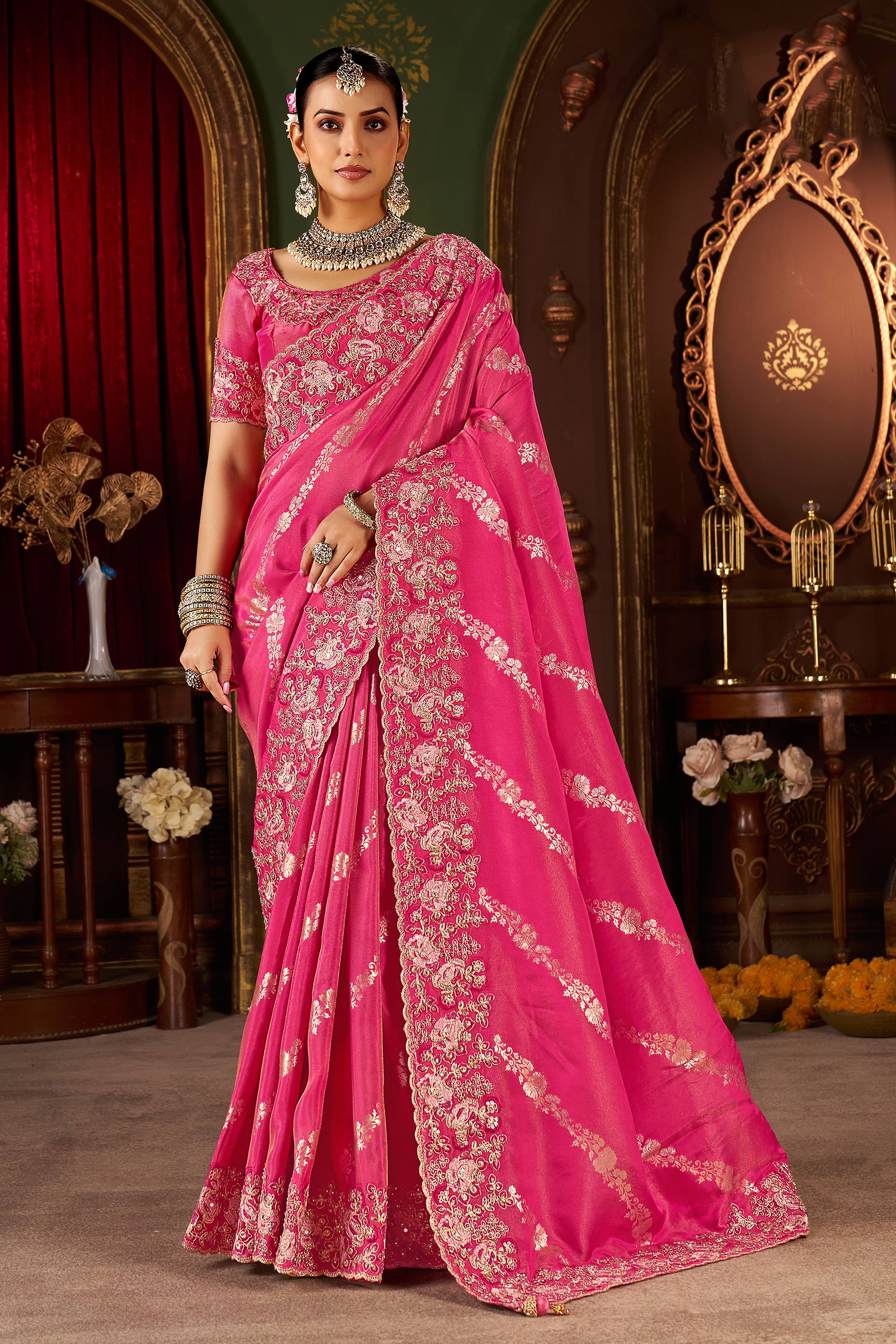 Make a bold statement with this elegant wedding and bridal designer saree, crafted with care from premium silk material. Its richly detailed embroidery along the borders adds an eye catching flair thats perfect for your special occasions. The saree combines traditional craftsmanship with modern aesthetics to provide a striking look. It comes with an unstitched blouse piece for added flexibility, making it a must have addition to your wardrobe for weddings, receptions, or cultural celebrations.