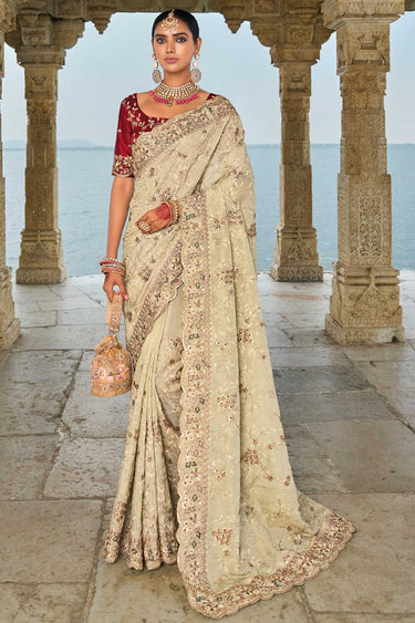 Cream Color Heavy Embroidered Work Banarasi Fabric Incredible Saree