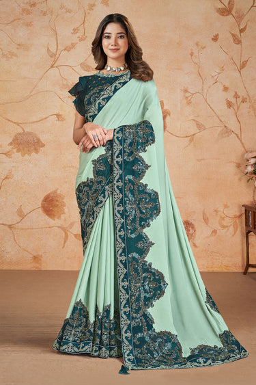Georgette Silk Sea Green Embroidered Border Work Party Wear Saree
