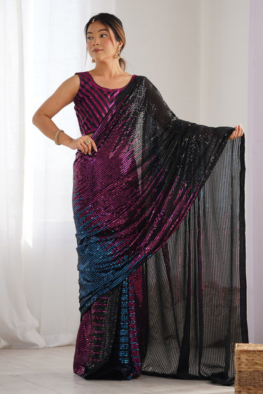 Step into any celebration with confidence wearing this beautiful black saree from our party collection. The saree is made from premium georgette and embellished with designer sequance embroidery work. Accompanying it is an unstitched satin Banglori blouse piece, giving you the freedom to design as you wish. Perfect for parties, functions, and weddings, this 5.5 meter saree with a 0.80 meter blouse piece should be dry cleaned only. Slight color variations may occur.