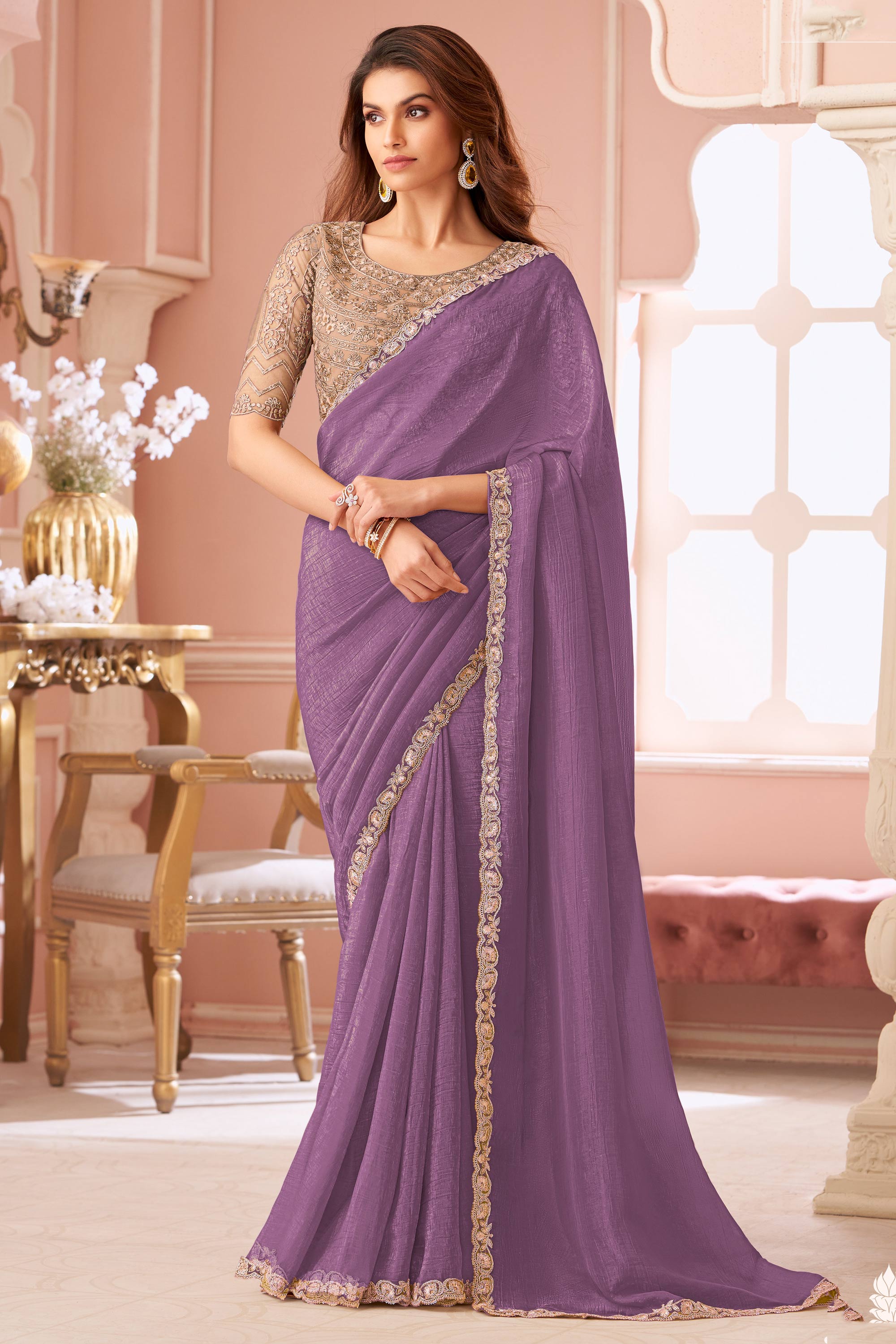 Purple Georgette Lace Border Work Saree For Sangeet Wear