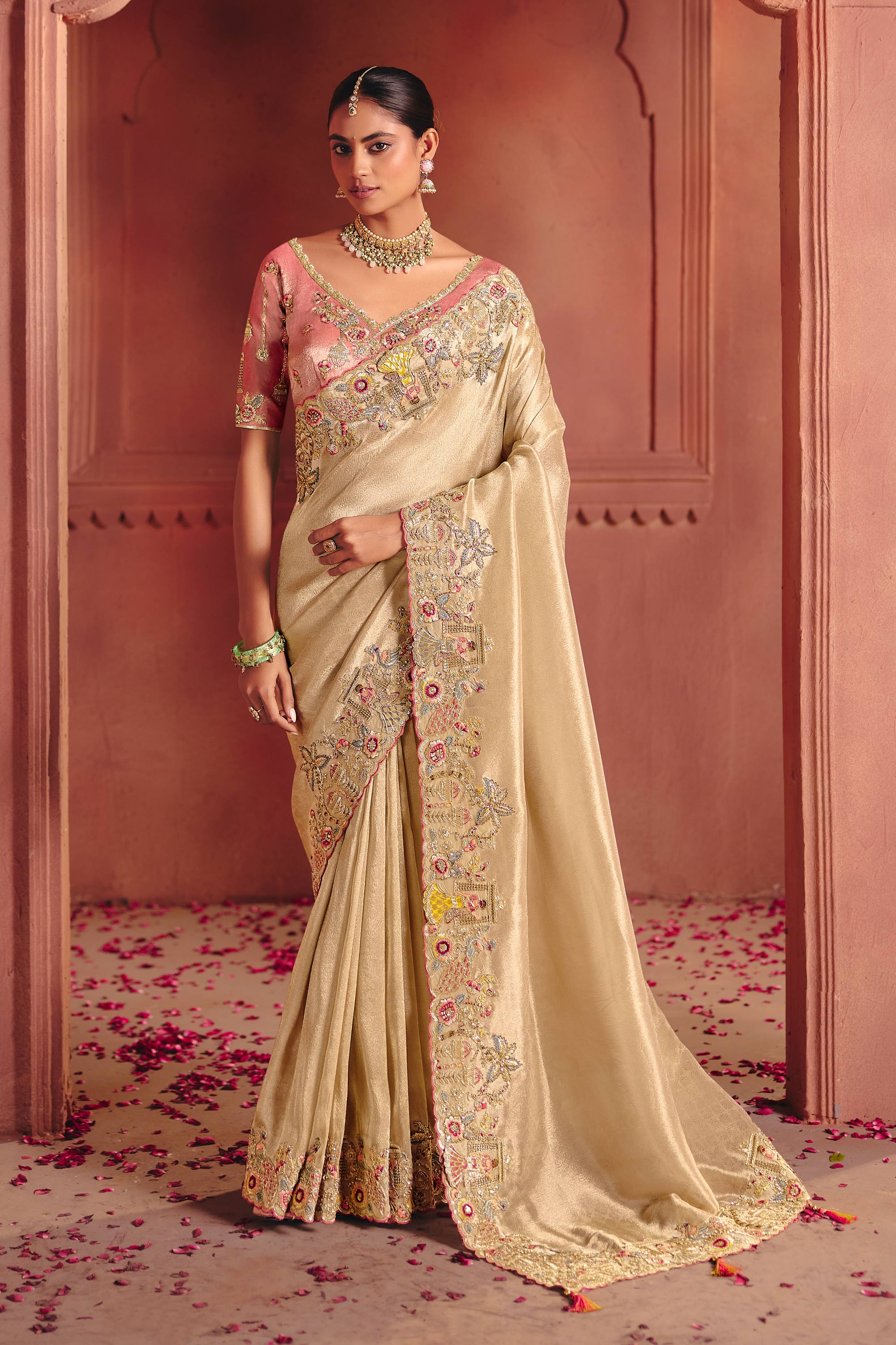 Silk Fabric Embroidered Beige Wedding Wear Saree