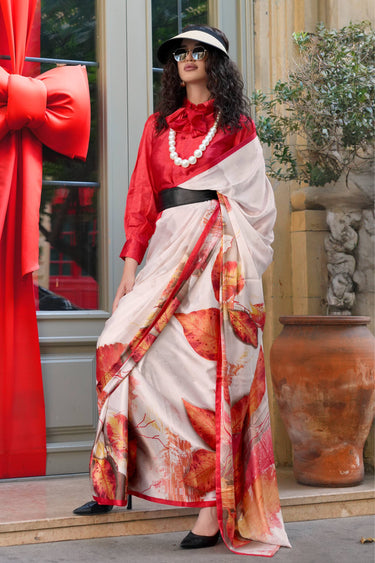 Off White Casual Wear Digital Printed Satin Fabric Saree