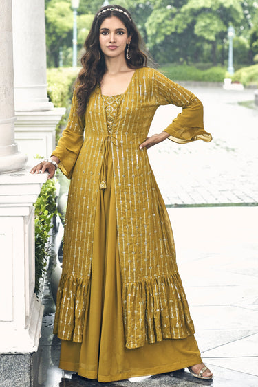Mustard Color Party Wear Embroidered Readymade Designer Sharara Style Palazzo Suit In Georgette Fabric