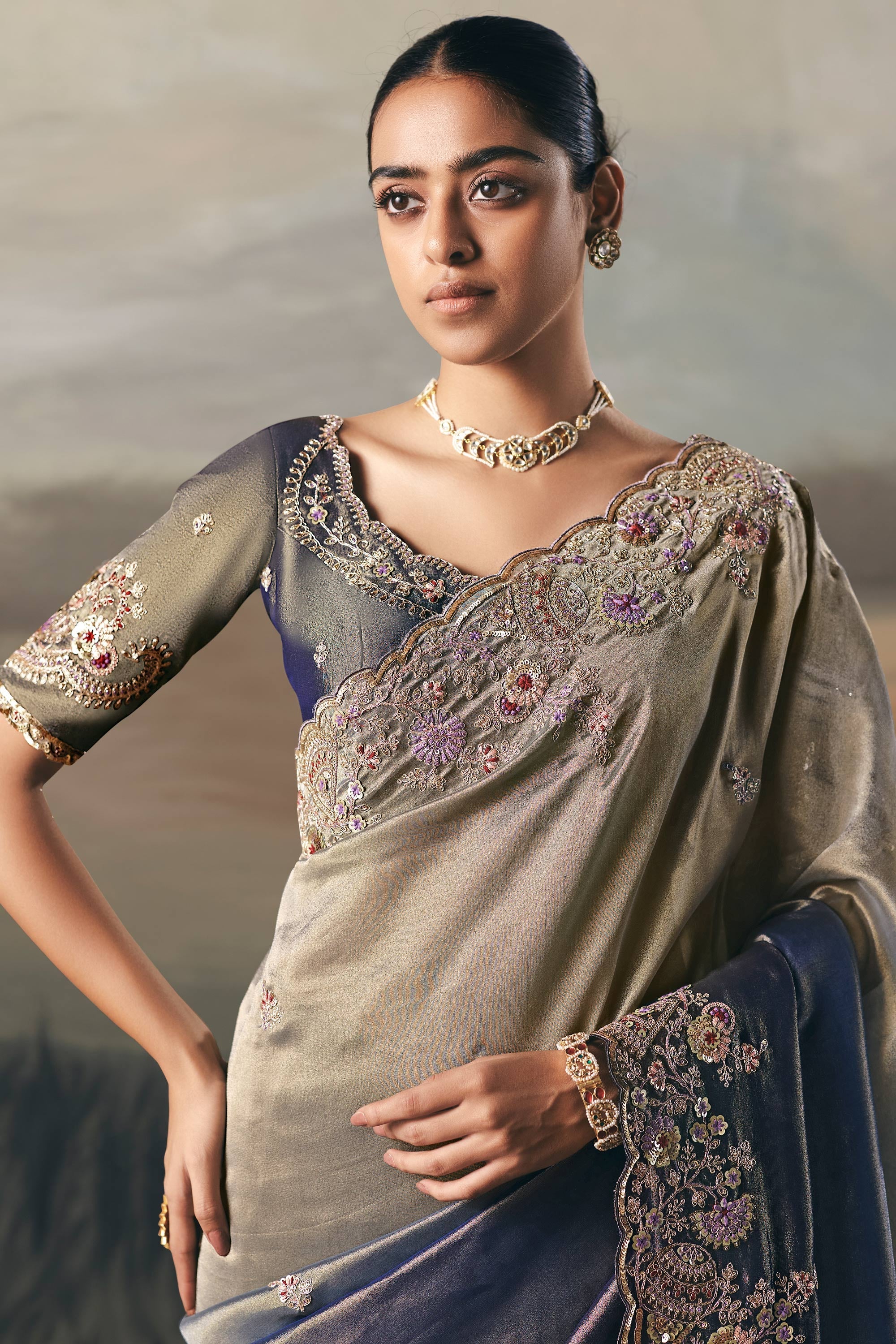 Enhance your ethnic wardrobe with this Reach Color Premium Tissue Saree featuring an elegant zari heavy border. Perfect for Sangeet celebrations or special occasions, this saree offers a combination of traditional craftsmanship and modern design. The premium tissue fabric lends a rich, luxurious drape, ensuring you feel both stylish and comfortable. Accompanied by a beautifully embroidered blouse, this ensemble is designed to make a statement at every event. The intricate border work adds charm and refinement, making it an ideal pick for those who love classic yet contemporary fashion.