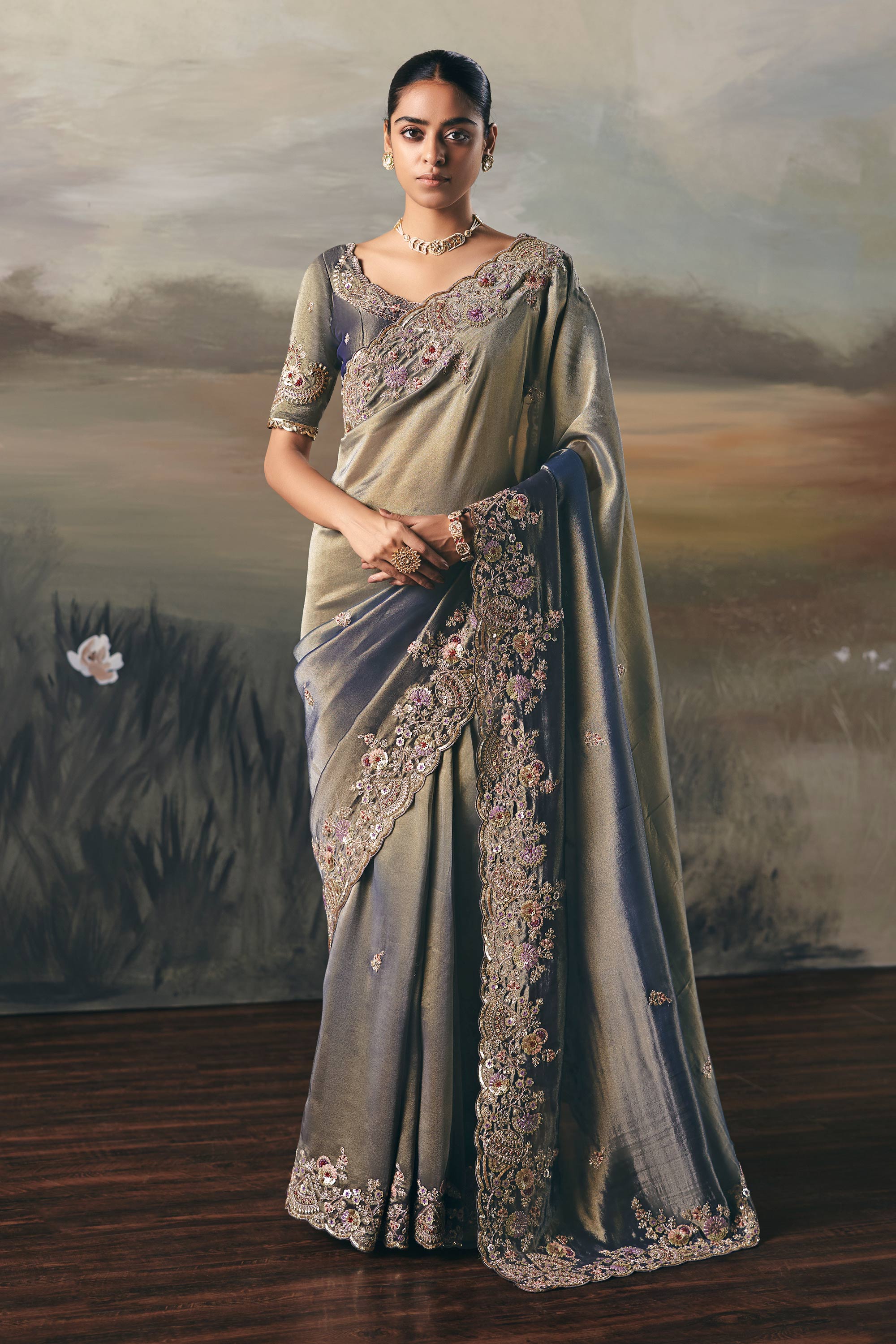 Grey Sangeet Wear Tissue Border Work Saree