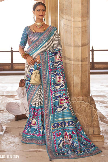 Patola Silk Fabric Function Wear Printed Luxurious Saree With Semi Stitched Blouse In Cyan Color