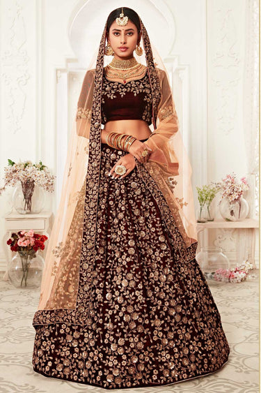 Sequins Work On Velvet Fabric Bewitching Lehenga In Brown Color