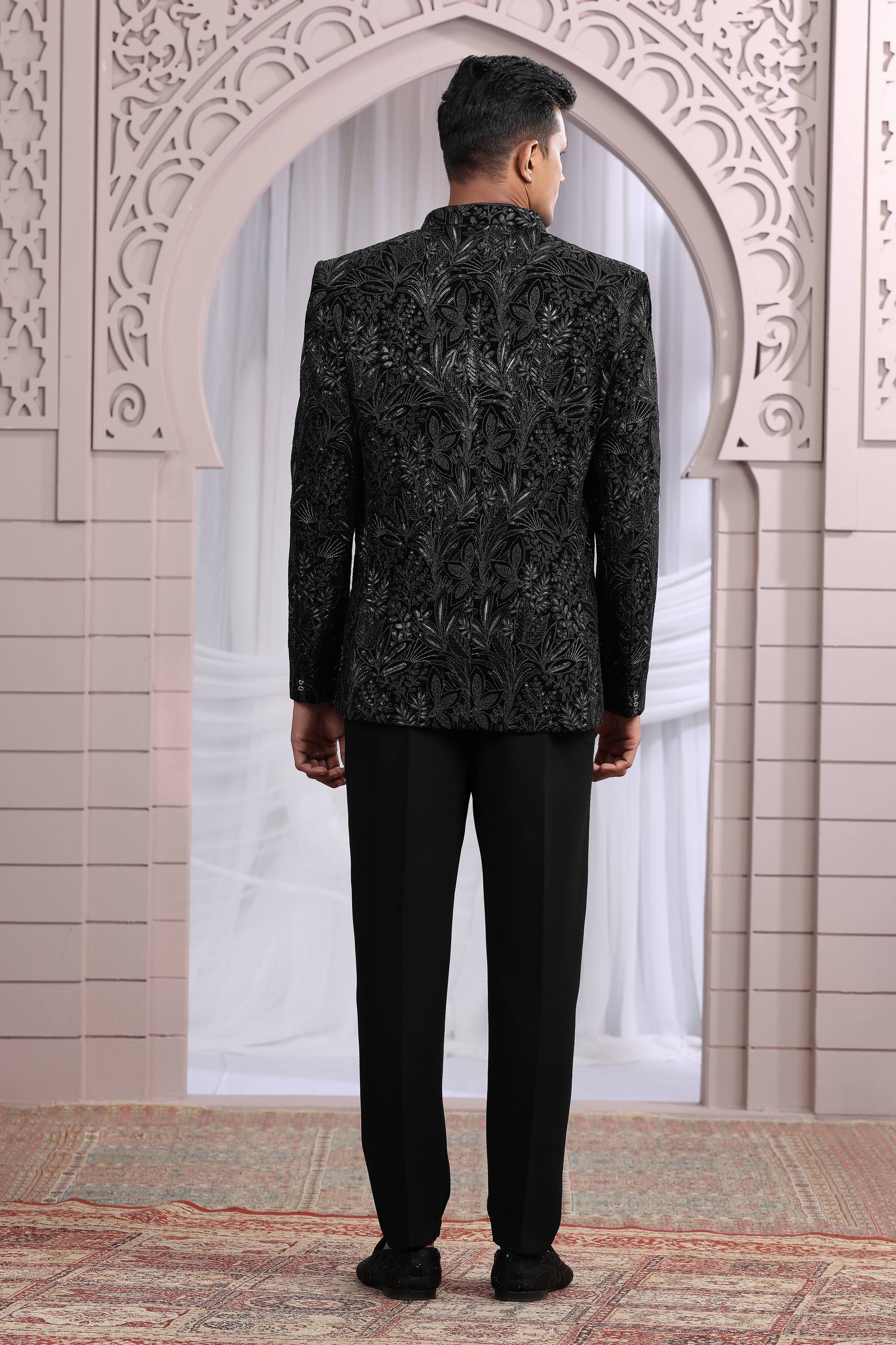 Velvet Black Wedding Wear Readymade Glamorous Indo Western Jodhpuri Suit For Men