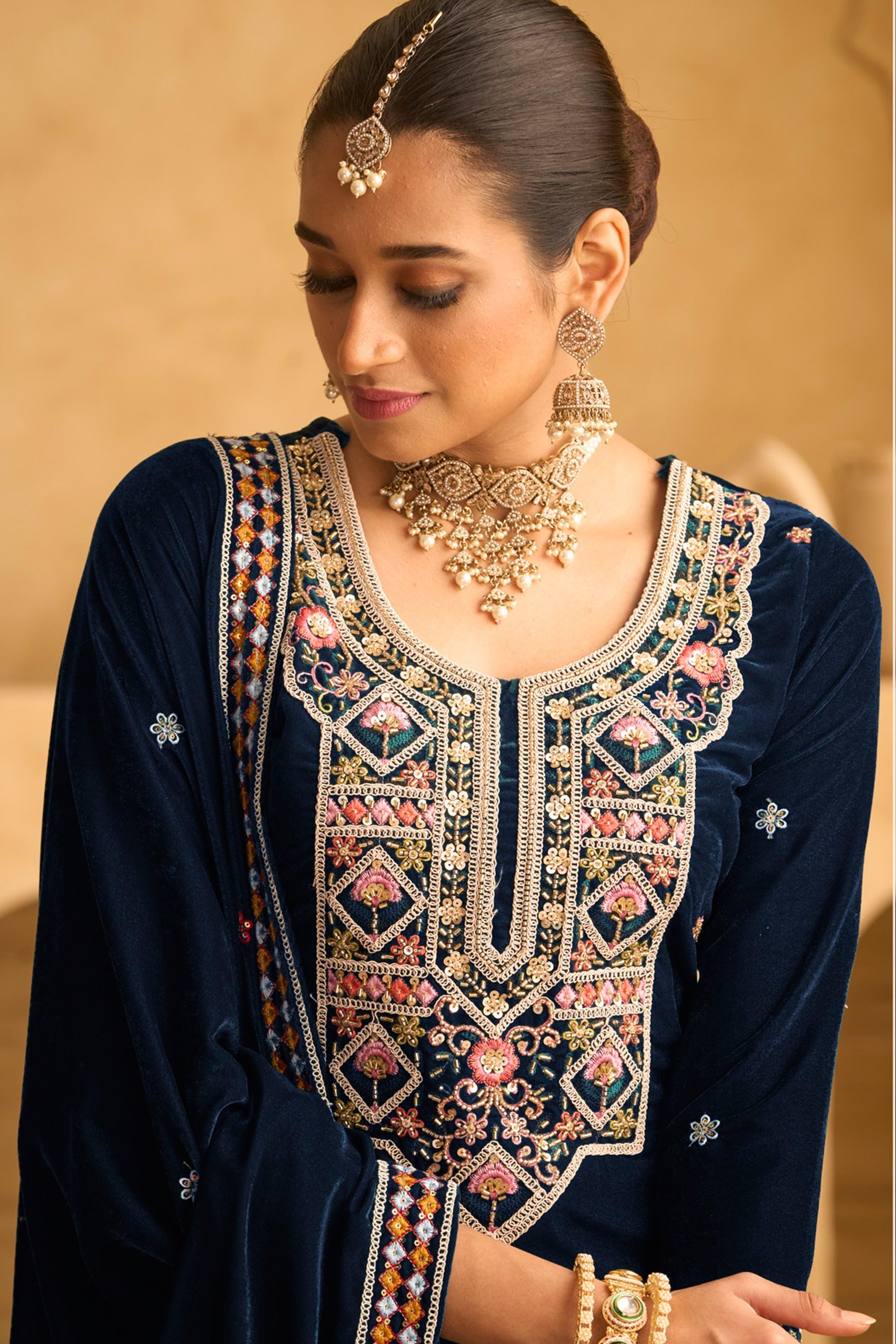 Velvet Navy Blue Party Wear Palazzo Salwar Suit